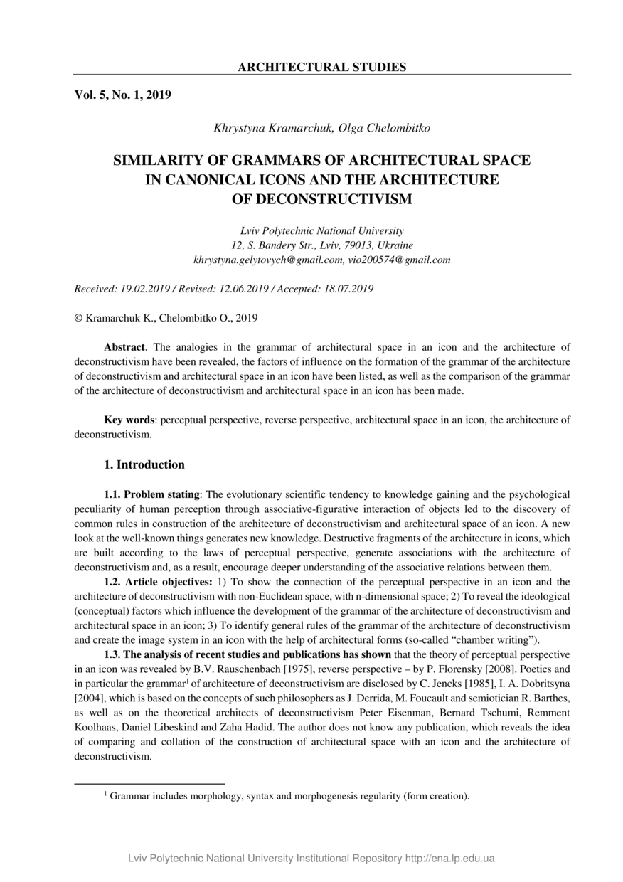 | dc.identifier.citationen | Kramarchuk K. Similarity of grammars of architectural space in canonical icons and the architecture of deconstructivism / Khrystyna Kramarchuk, Olga Chelombitko // Architectural Studies. — Lviv : Lviv Politechnic Publishing House, 2019. — Vol 5. — No 1. — P. 18–26. | |