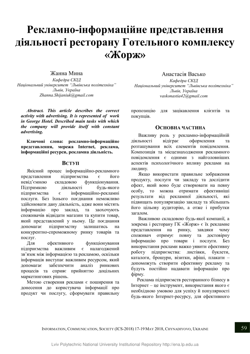 Мина Ж. Рекламно-інформаційне представлення діяльності ресторану Готельного комплексу «Жорж» / Жанна Мина, Анастасія Васько // Інформація, комунікація, суспільство : матеріали 7-ї Міжнародної наукової конференції, 17–19 травня 2018 року, Чинадієво. — Львів : Видавництво Львівської політехніки, 2018. — С. 59–60. — (Інформаційні та комунікаційні технології в Internet та World Wide Web).