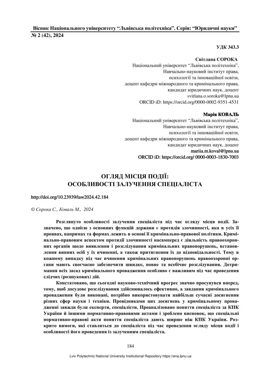 Сорока С. Огляд місця події: особливості залучення спеціаліста / Світлана Сорока, Марія Коваль // Вісник Національного університету “Львівська політехніка”. Серія: Юридичні науки. — Львів : Видавництво Львівської політехніки, 2024. — № 2 (42). — С. 184–189.