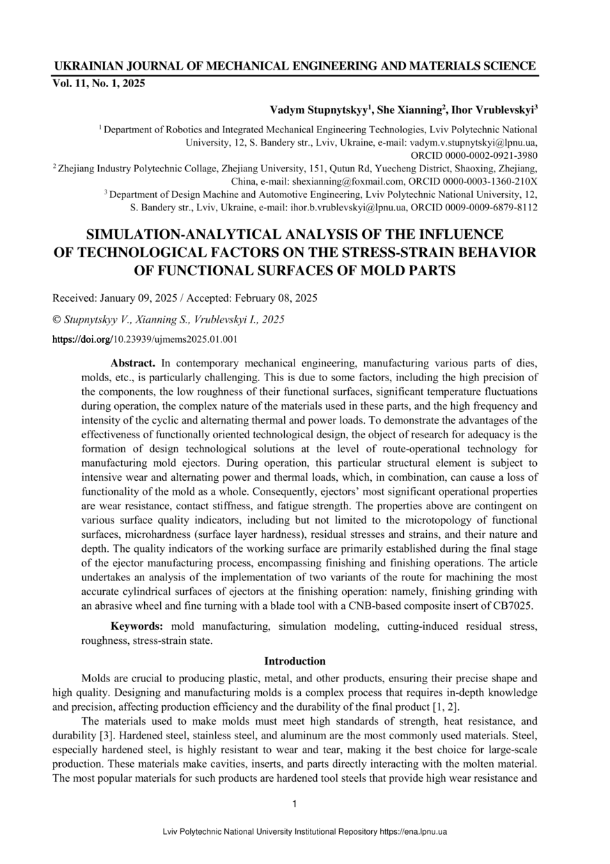 Stupnytskyy V. Simulation-analytical analysis of the influence of technological factors on the stress-strain behavior of functional surfaces of mold parts / Vadym Stupnytskyy, She Xianning, Ihor Vrublevskyi // Ukrainian Journal of Mechanical Engineering and Materials Science. — Lviv : Lviv Politechnic Publishing House, 2025. — Vol 11. — No 1. — P. 1–17.