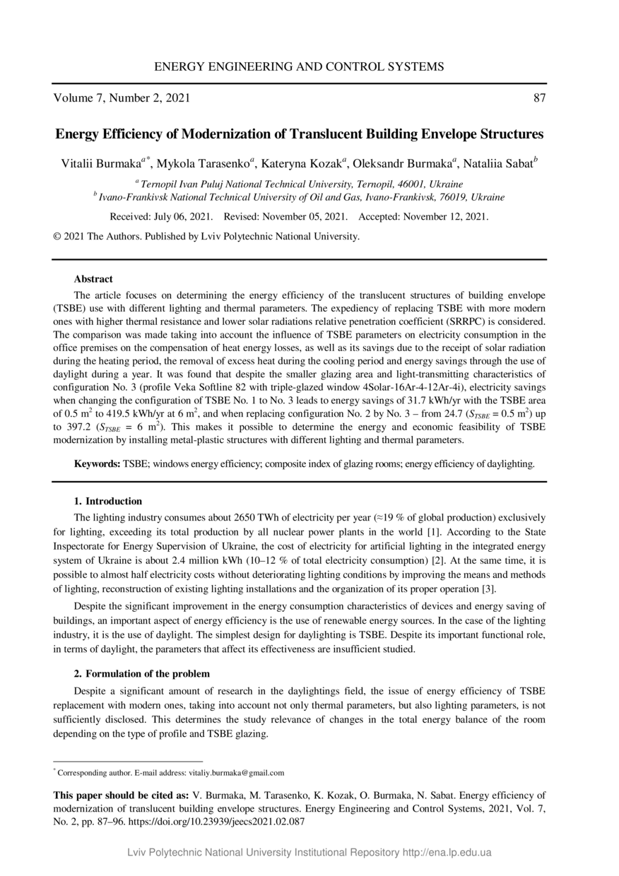 Energy efficiency of modernization of translucent building envelope structures / Vitalii Burmaka, Mykola Tarasenko, Kateryna Kozak, Oleksandr Burmaka, Nataliia Sabat // Energy Engineering and Control Systems. — Lviv : Lviv Politechnic Publishing House, 2021. — Vol 7. — No 2. — P. 87–96.