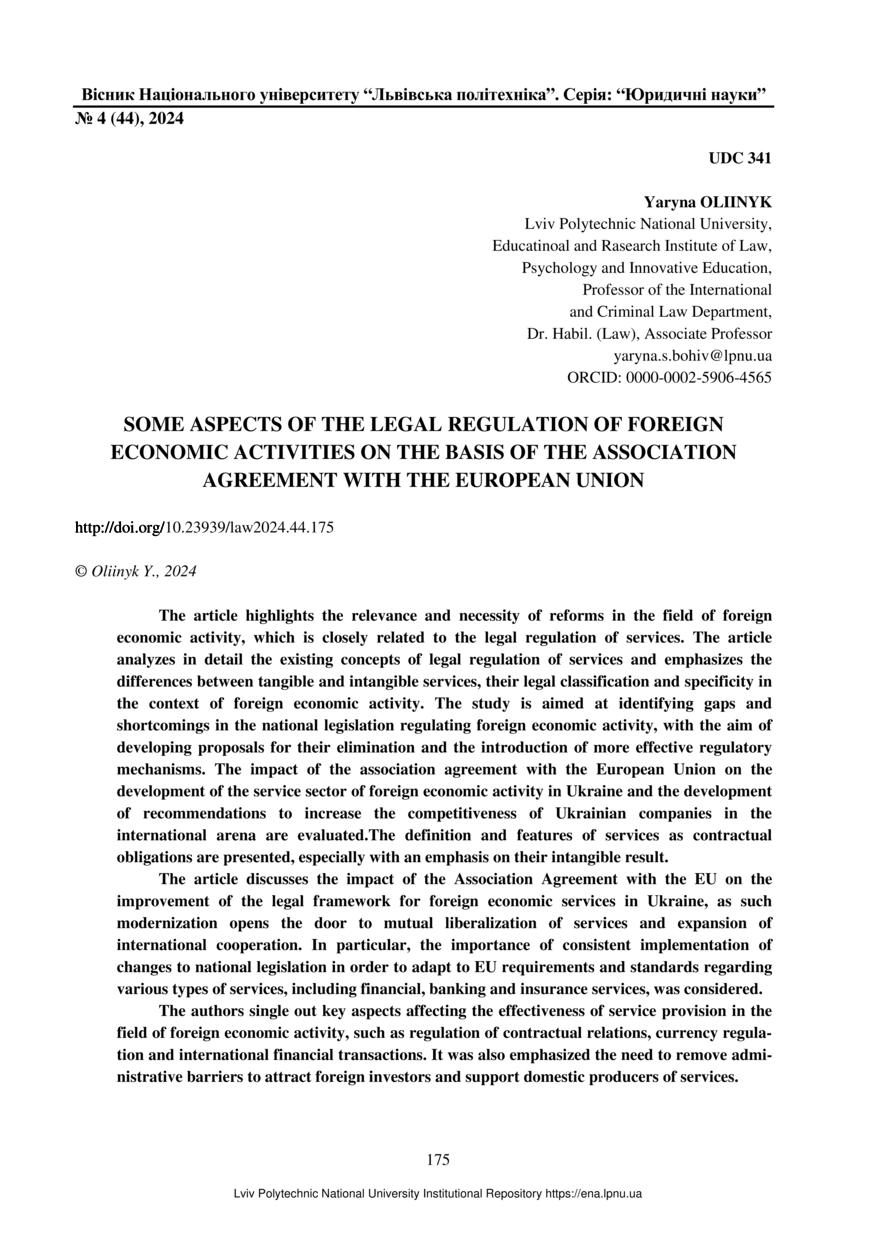 Oliinyk Y. Some Aspects of the Legal Regulation of Foreign Economic Activities on the Basis of the Association Agreement with the European Union / Yaryna Oliinyk // Вісник Національного університету “Львівська політехніка”. Серія: “Юридичні науки”. — Lviv : Lviv Politechnic Publishing House, 2024. — No 4(44). — P. 175–185.