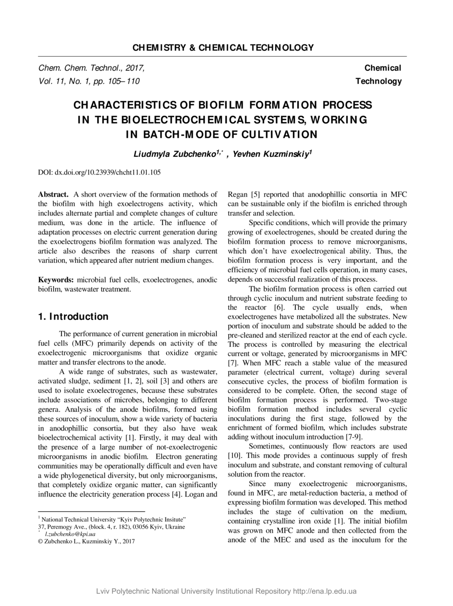 | dc.identifier.citationen | Zubchenko L. Characteristics of biofilm formation process in the bioelectrochemical systems, working in batch-mode of cultivation / Liudmyla Zubchenko, Yevhen Kuzminskiy // Chemistry & Chemical Technology. — Lviv : Lviv Politechnic Publishing House, 2017. — Vol 11. — No 1. — P. 105–110. | |