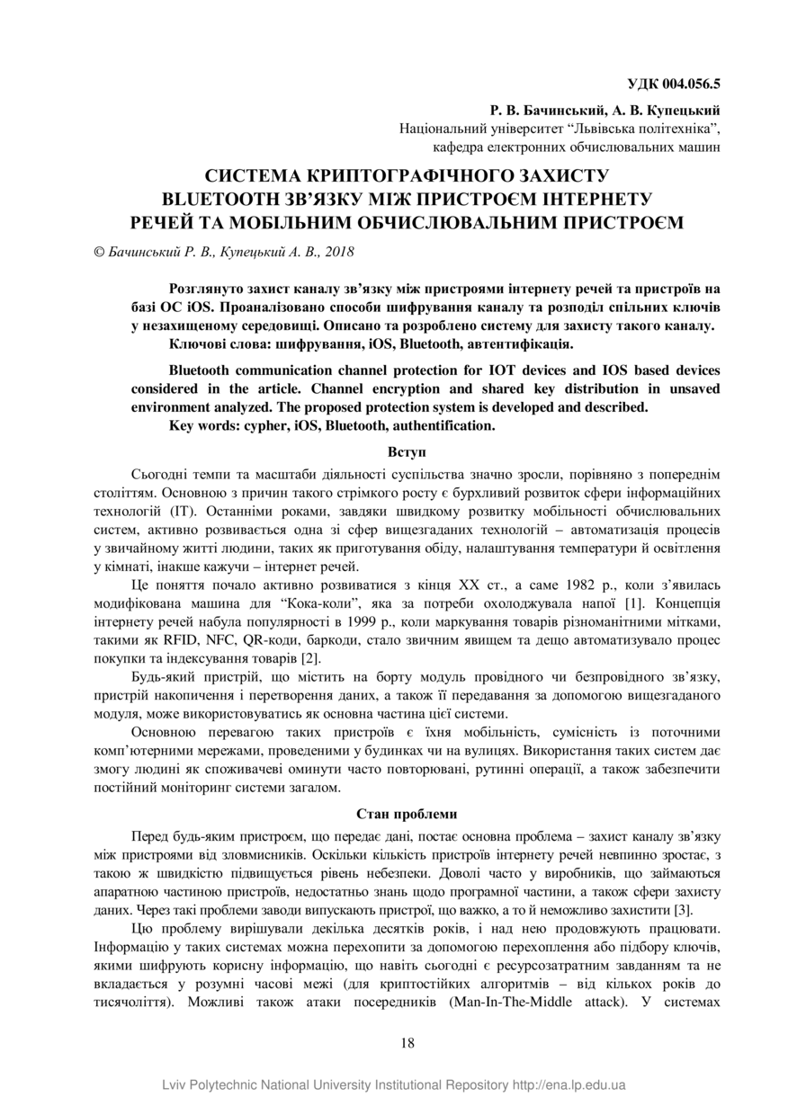 | dc.identifier.citationen | Bachynskyy R. Crypto-protection systemof ble-based communication channel for iot devices and mobile computational device / Ruslan Bachynskyy, Andriy Kupetskyy // Visnyk Natsionalnoho universytetu "Lvivska politekhnika". Serie: Informatsiini systemy ta merezhi. — Vydavnytstvo Lvivskoi politekhniky, 2018. — No 887. — P. 18–24. — (Informatsiini systemy, merezhi ta tekhnolohii). | |
