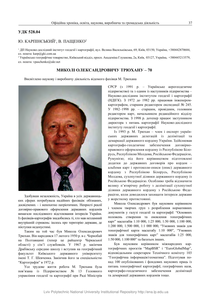 | dc.identifier.citationen | Karpinsky Y. The 70th annivessary of Mykola Triukhan / Y. Karpinsky, V. Pashchenko // Suchasni dosiahnennia heodezychnoi nauky ta vyrobnytstva. — Lviv : Lviv Politechnic Publishing House, 2020. — Vol 1(39). — P. 37–40. | |