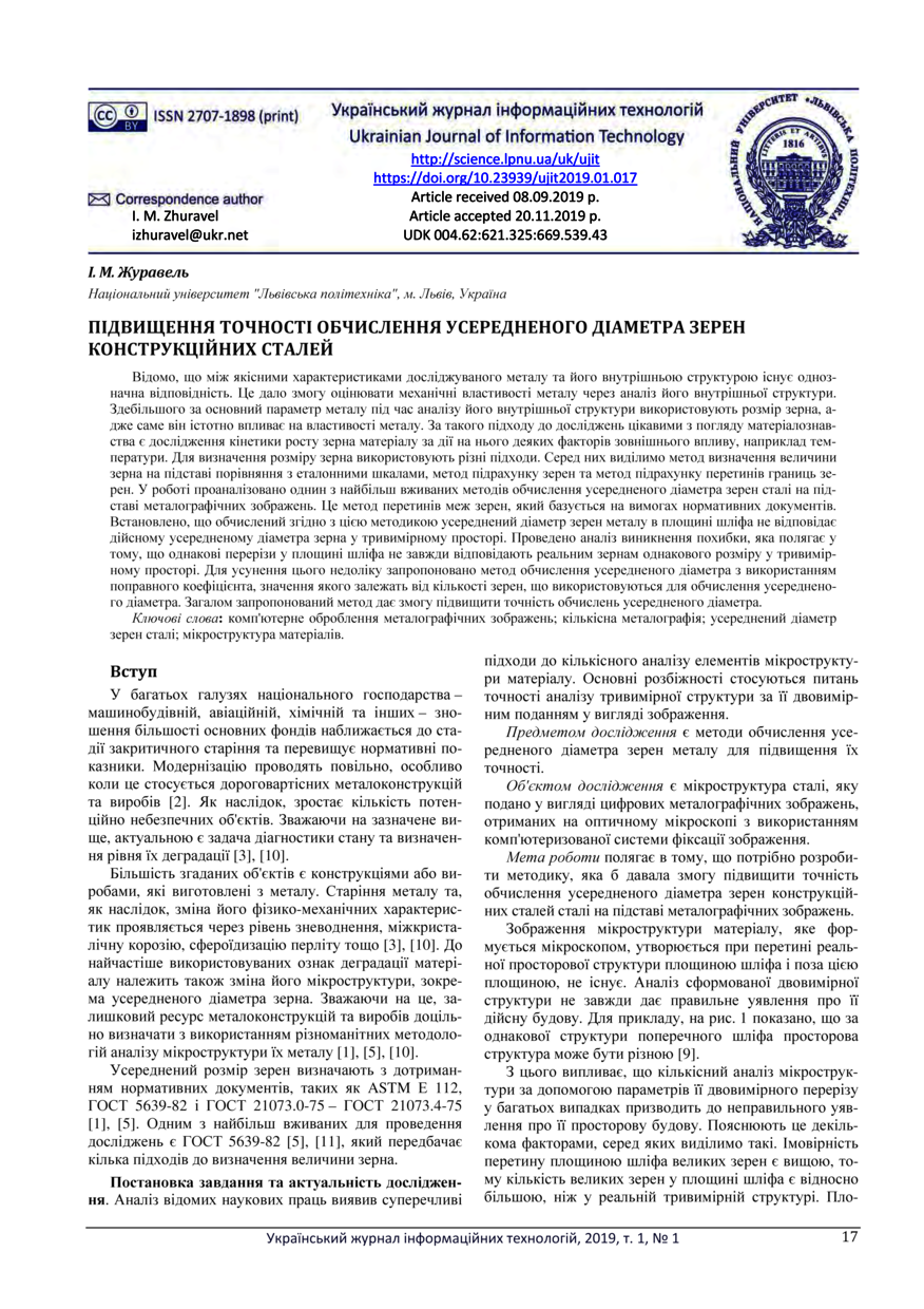 Журавель І. М. Підвищення точності обчислення усередненого діаметра зерен конструкційних сталей / І. М. Журавель // Український журнал інформаційних технологій. — Львів : Видавництво Львівської політехніки, 2019. — Том 1. — № 1. — С. 17–21.