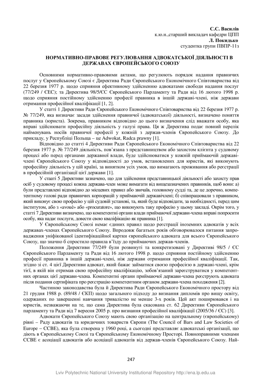 Василів С. С. Нормативно-правове регулювання адвокатської діяльності в державах Європейського Союзу / С. С. Василів, Л. Покидько // Захист прав і свобод людини та громадянина в умовах формування правової держави : збірник тез ІХ Всеукраїнської науково-практичної конференції, 30 травня 2020 року, Львів. — Львів : Видавництво Львівської політехніки, 2020. — С. 247–248. — (Цивільно-правові аспекти захисту прав і свобод людини та громадянина в умовах формування правової держави).