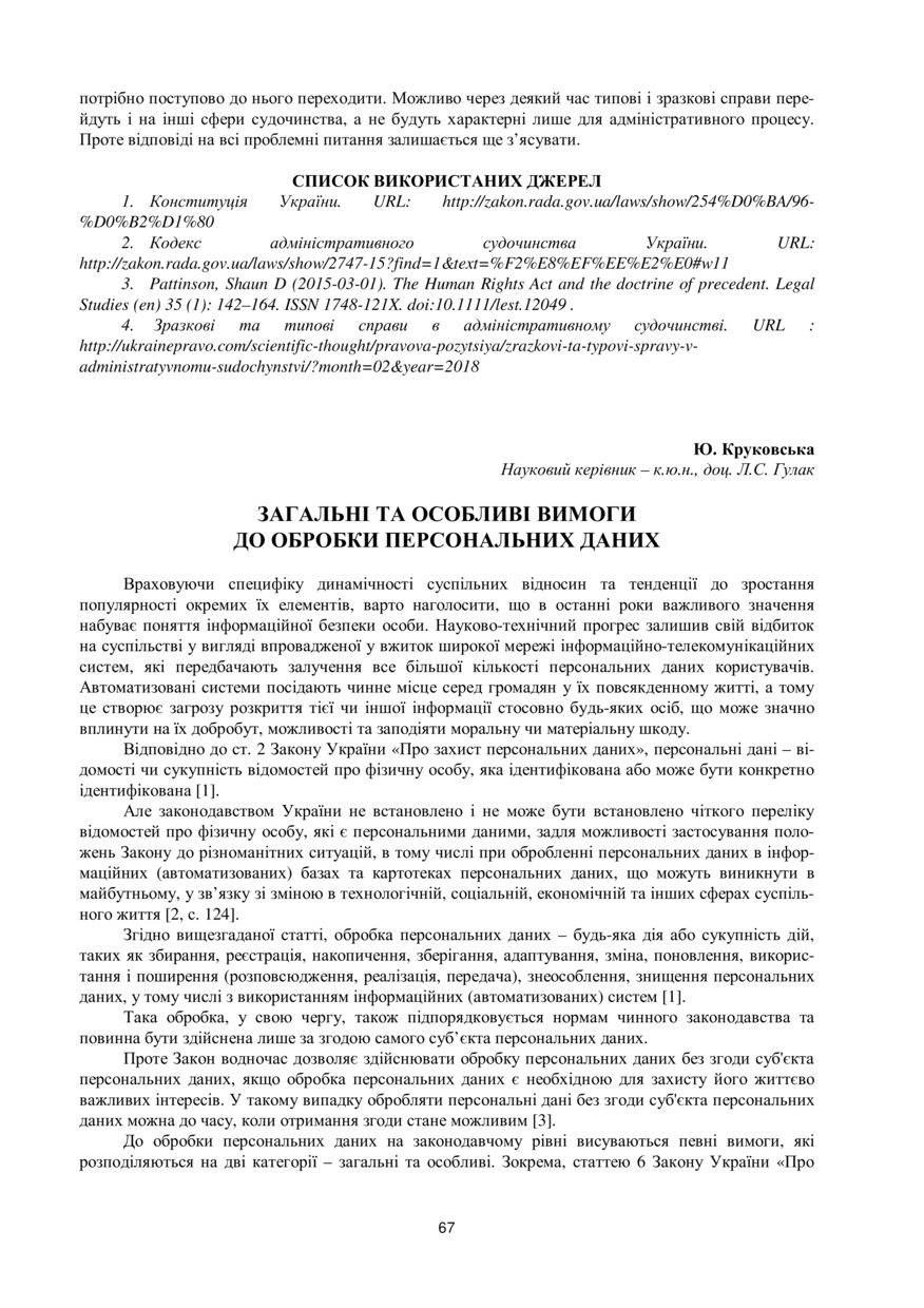 Круковська Ю. Загальні та особливі вимоги до обробки персональних даних / Ю. Круковська, Л. С. Гулак // 76-та Студентська науково-технічна конференція. Секція права та психології : збірник тез доповідей, 15–29 жовтня 2018 року, Львів. — Львів : Видавництво Львівської політехніки, 2018. — С. 67–69. — (Адміністративного та інформаційного права).