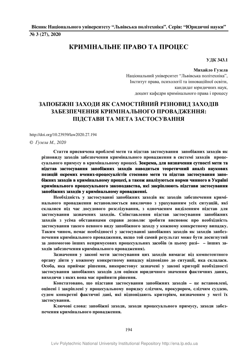 Гузела М. Запобіжні заходи як самостійний різновид заходів забезпечення кримінального провадження: підстави та мета застосування / Михайло Гузела // Вісник Національного університету “Львівська політехніка”. Серія: Юридичні науки. — Львів : Видавництво Львівської політехніки, 2020. — Том 7. — № 3 (27). — С. 194–198.