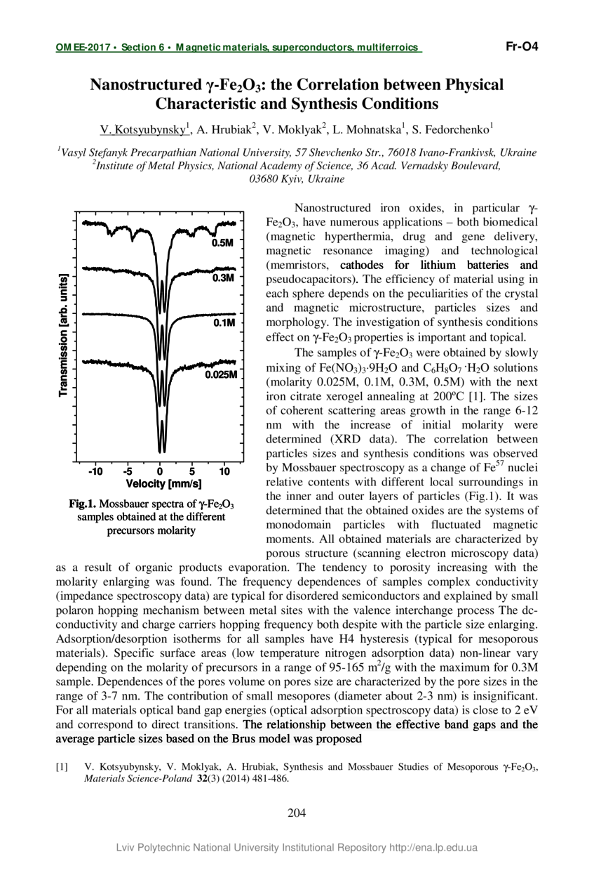 Nanostructured γ-Fe2O3: the Correlation between Physical Characteristic and Synthesis Conditions / V. Kotsyubynsky, A. Hrubiak, V. Moklyak, L. Mohnatska, S. Fedorchenko // Oxide Materials