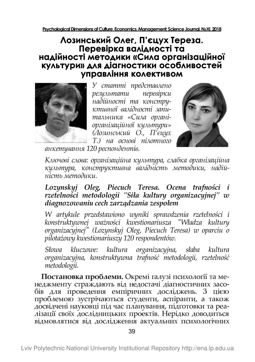 | dc.identifier.citationen | Lozinskii O. Perevirka validnosti ta nadiinosti metodyky "Syla orhanizatsiinoi kultury" dlia diahnostyky osoblyvostei upravlinnia kolektyvom / Oleh Lozynskyi, Tereza Pietsukh // Psykholohichni vymiry kultury, ekonomiky, upravlinnia : naukovyi zhurnal. — Lviv, 2018. — Vol 12. — P. 39–48. | |