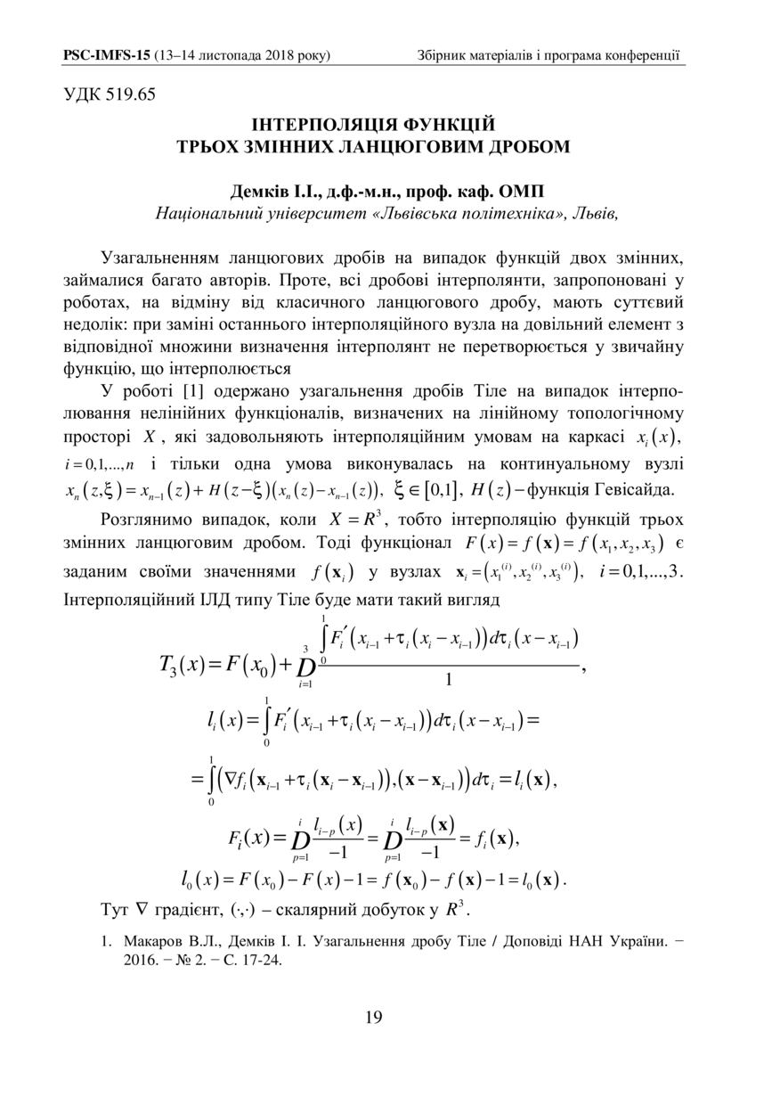Демків І. І. Інтерполяція функцій трьох змінних ланцюговим дробом / І. І. Демків // 15-та Відкрита наукова конференція Інституту прикладної математики та фундаментальних наук (ІМФН) : збірник матеріалів і програма конференції, 13–14 листопада 2018 року, Львів. — Львів : Видавництво Львівської політехніки, 2018. — С. 19. — (Математика).