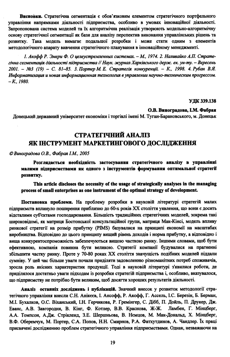 Виноградова О. В. Стратегічний аналіз як інструмент маркетингового дослідження / О. В. Виноградова, І. М. Фабрая // Вісник Національного університету “Львівська політехніка”. — Львів : Видавництво Національного університету “Львівська політехніка”, 2005. — № 526 : Логістика. — С. 19–22. — (Теорія логістики і маркетингу).