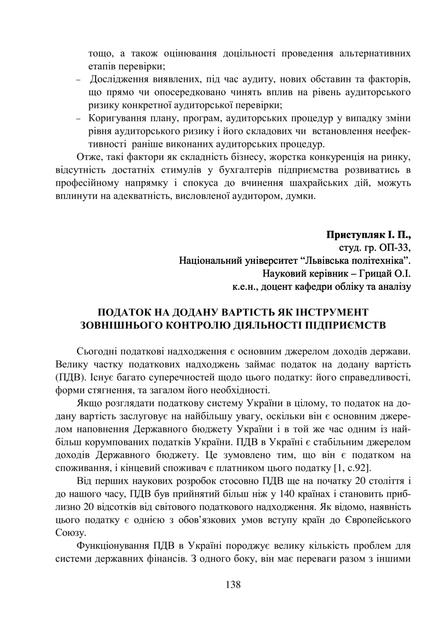 Приступляк І. П. Податок на додану вартість як інструмент зовнішнього контролю діяльності підприємств / І. П. Приступляк, О. І. Грицай // Облік, аналіз і контроль в системі управління суб’єктами економіки : тези доповідей ІV Міжнародної студентської наукової конференції, 18–19 жовтня 2018 року, Львів. — Львів : Видавництво Львівської політехніки, 2018. — С. 138–140. — (Проблеми та перспективи розвитку аудиторської діяльності в Україні).