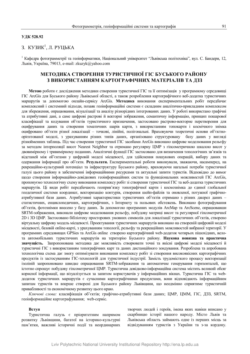 Кузик З. Методика створення туристичної гіс Буського району з використанням картографічних матеріалів та ДЗЗ / З. Кузик, Л. Руцька // Сучасні досягнення геодезичної науки та виробництва. — Львів : Видавництво Львівської політехніки, 2019. — № 1(37). — С. 91–99.