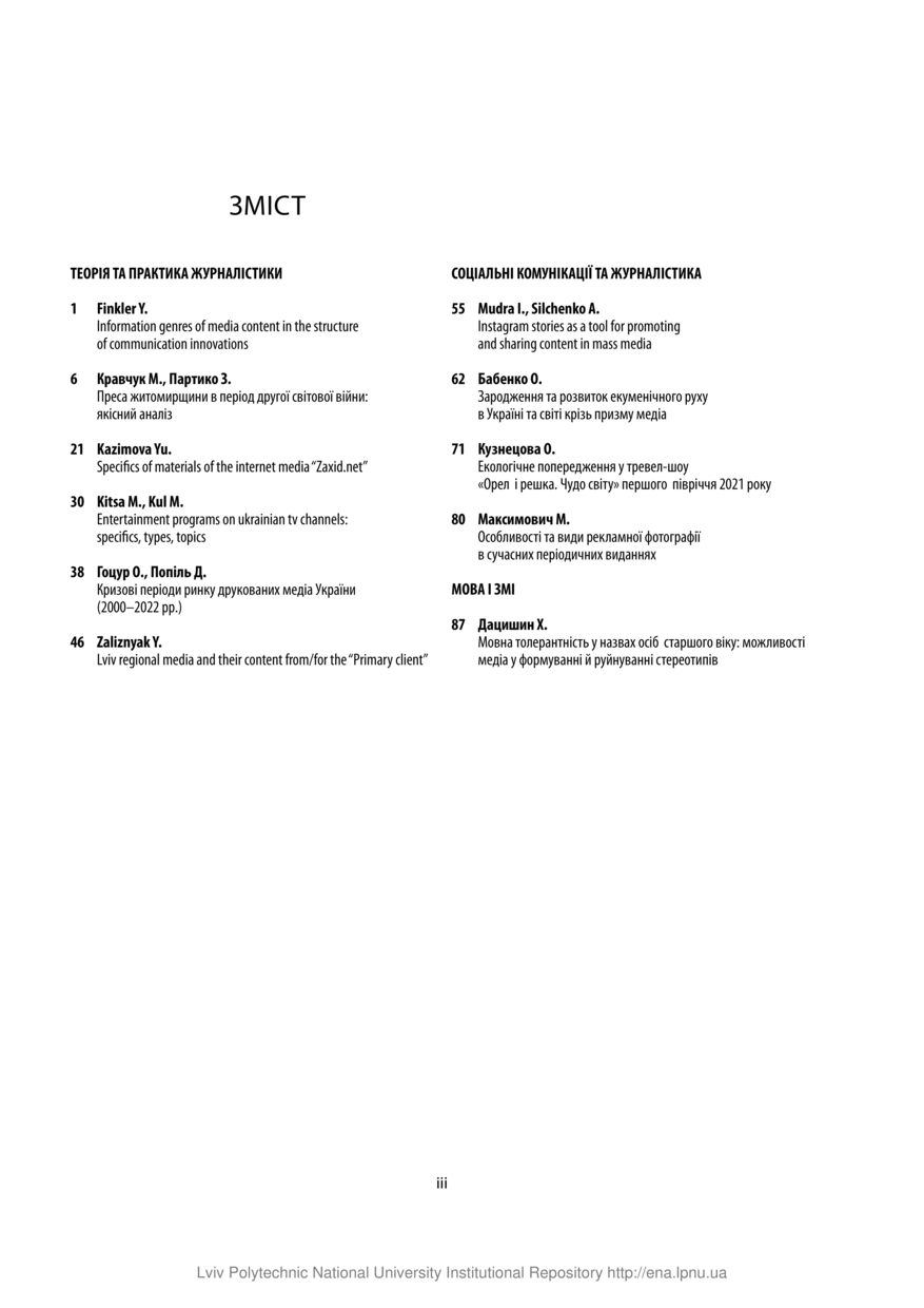 | dc.identifier.citationen | Contents // Bulletin of Lviv Polytechnic National University: journalism. — Lviv : Lviv Politechnic Publishing House, 2022. — Vol 2 (4). — P. 95–96. | |