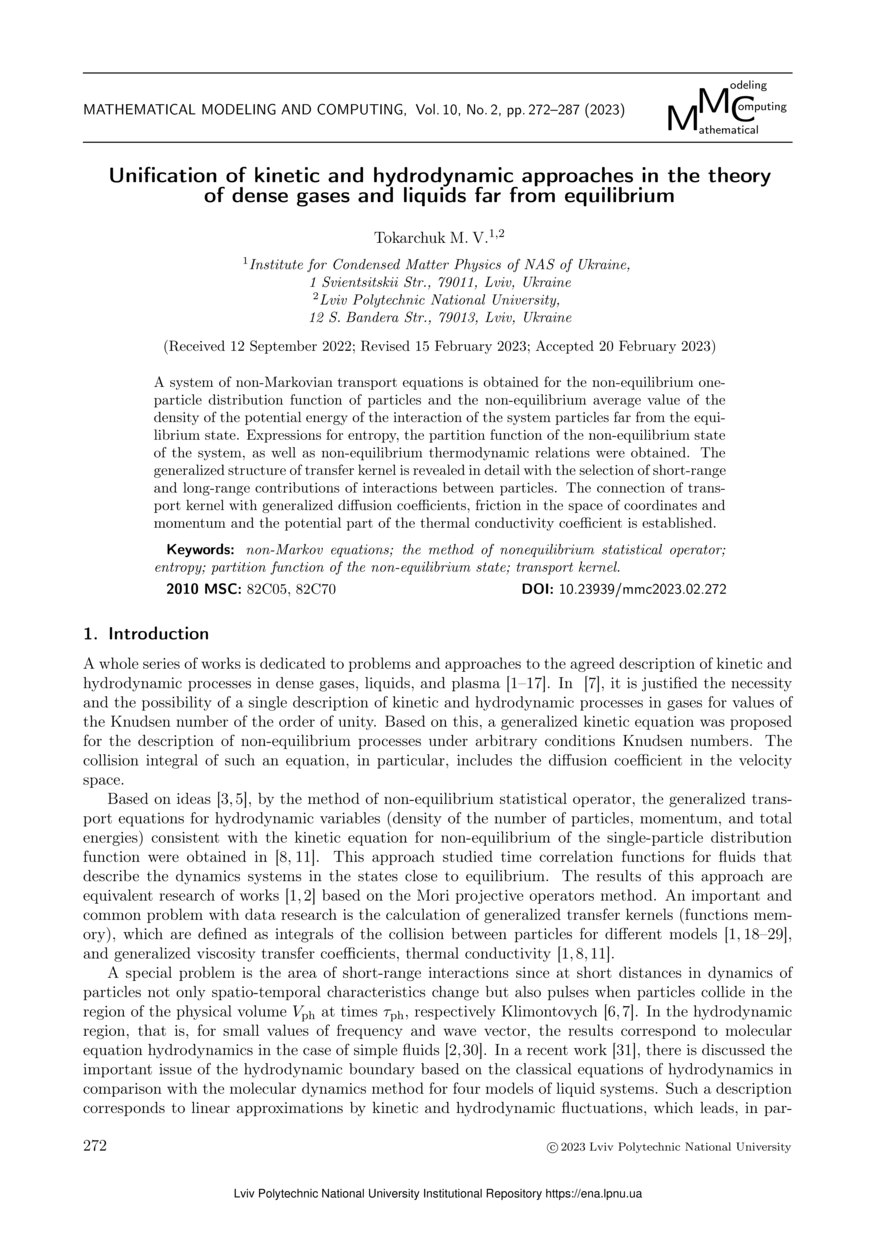 Tokarchuk M. V. Unification of kinetic and hydrodynamic approaches in the theory of dense gases and liquids far from equilibrium / M. V. Tokarchuk // Mathematical Modeling and Computing. — Lviv : Lviv Politechnic Publishing House, 2023. — Vol 10. — No 2. — P. 272–287.