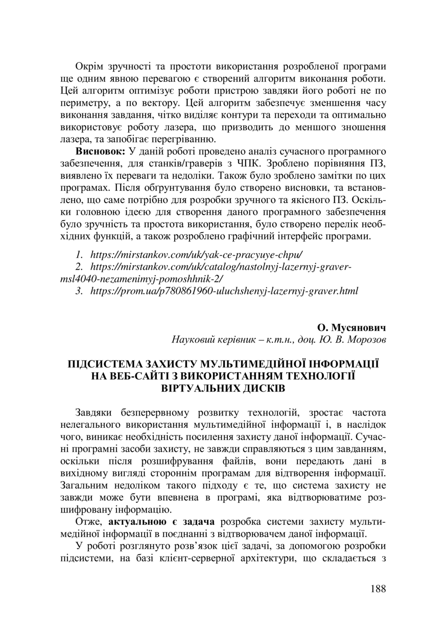 Мусянович О. Підсистема захисту мультимедійної інформації на веб-сайті з використанням технології віртуальних дисків / О. Мусянович, Ю. В. Морозов // 77-ма Студентська науково-технічна конференція : збірник тез доповідей, жовтень, Львів. — Львів : Видавництво Львівської політехніки, 2019. — С. 188–190. — (Секція комп’ютерних технологій, автоматики та метрології).