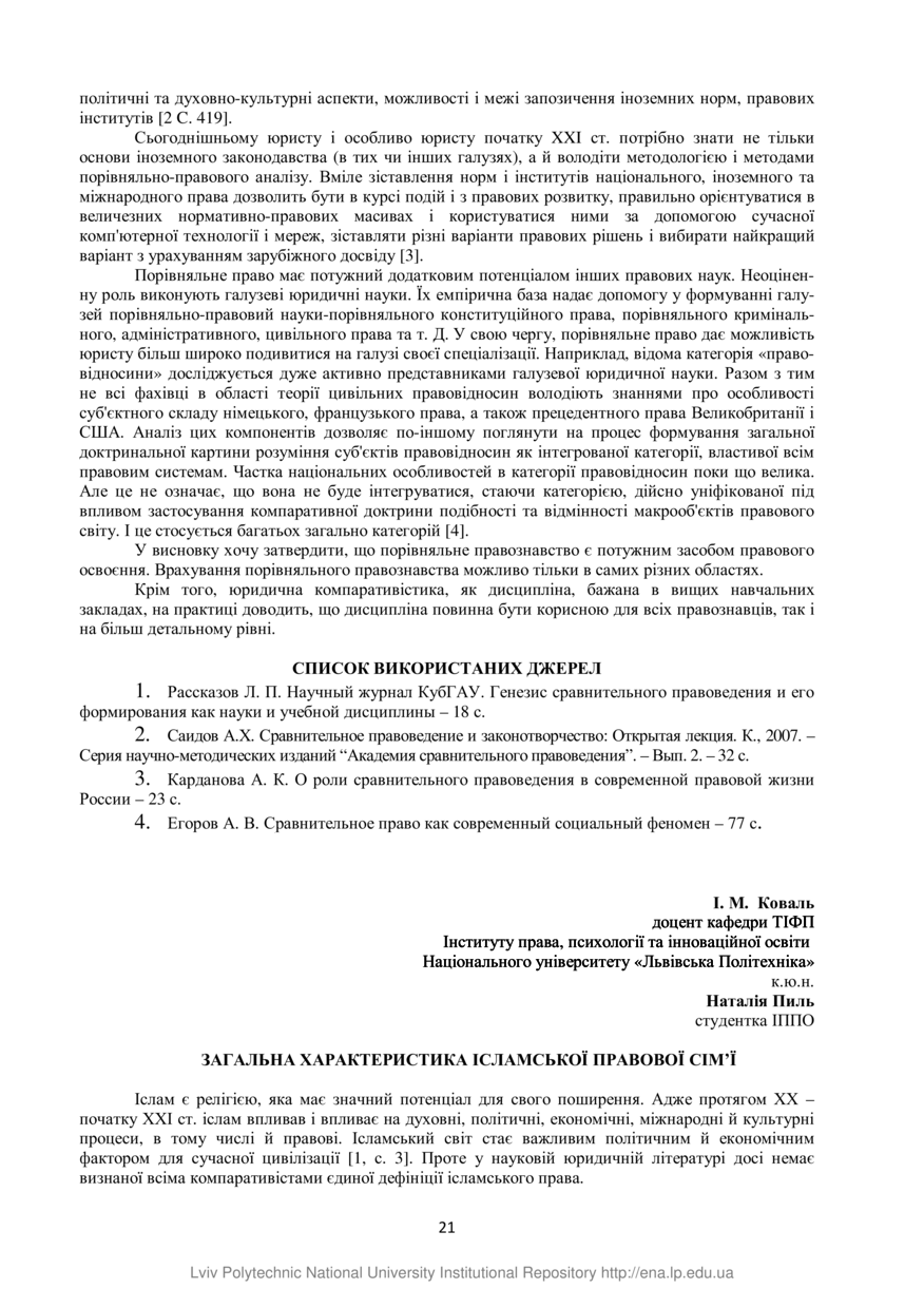 Коваль І. М. Загальна характеристика ісламської правової сім’ї / І. М. Коваль, Наталія Пиль // Захист прав і свобод людини та громадянина в умовах формування правової держави : збірник тез ІХ Всеукраїнської науково-практичної конференції, 30 травня 2020 року, Львів. — Львів : Видавництво Львівської політехніки, 2020. — С. 21–23. — (Історико-правові, конституційні та міжнародно-правові аспекти захисту прав і савобод людини та громадянина в умовах формування правової держави).