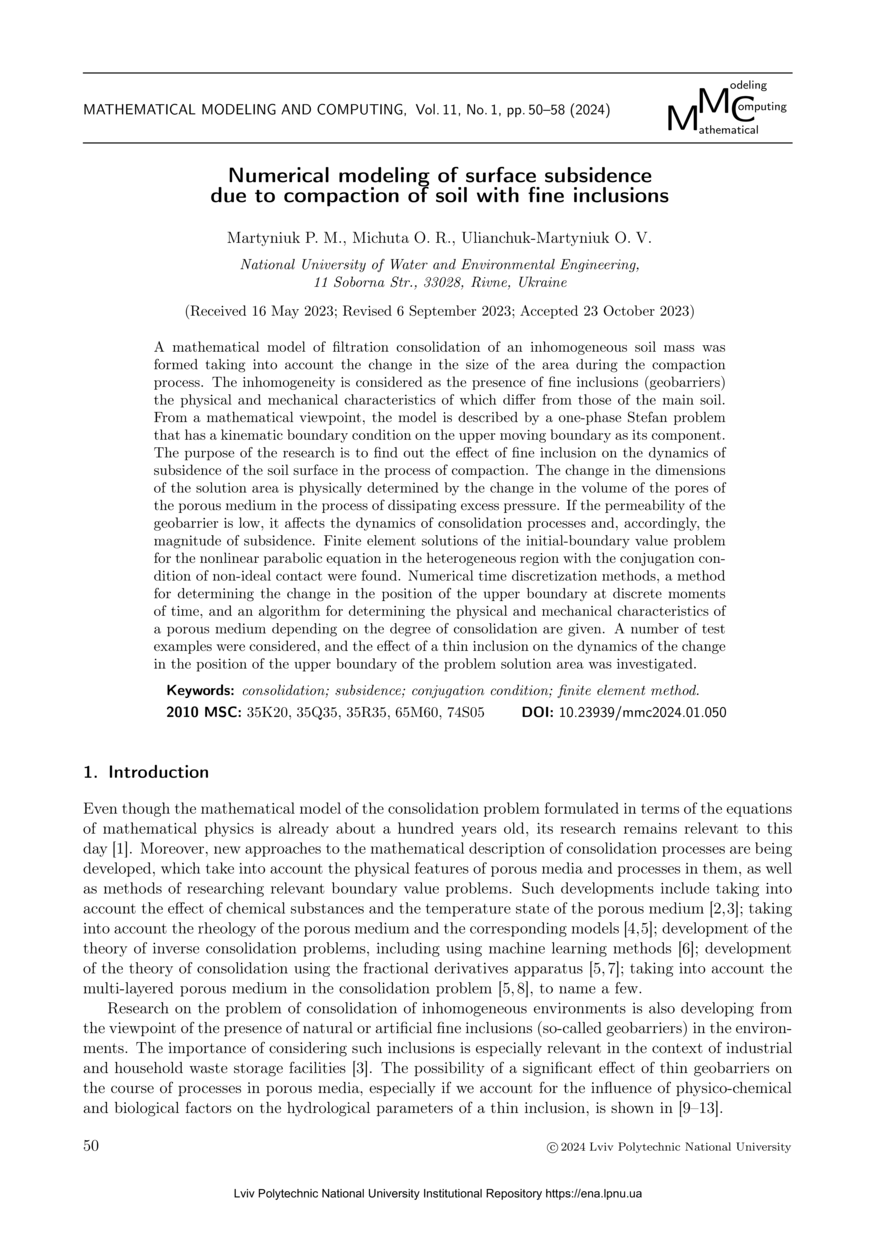 | dc.identifier.citationen | Martyniuk P. M. Numerical modeling of surface subsidence due to compaction of soil with fine inclusions / P. M. Martyniuk, O. R. Michuta, O. V. Ulianchuk-Martyniuk // Mathematical Modeling and Computing. — Lviv : Lviv Politechnic Publishing House, 2024. — Vol 1. — No 11. — P. 50–58. | |