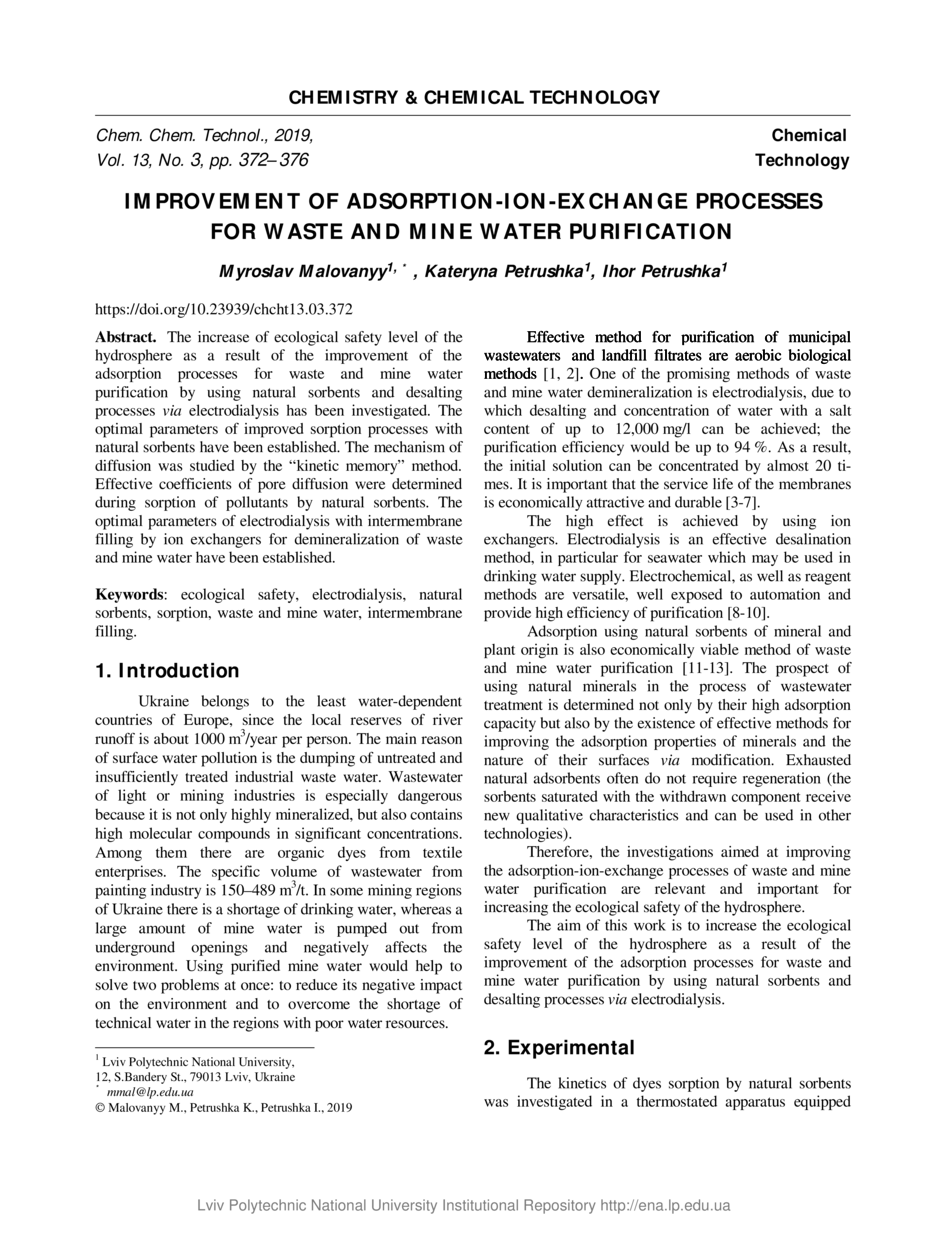 Malovanyy M. Improvement of Adsorption-Ion-Exchange Processes for Waste and Mine Water Purification / Myroslav Malovanyy, Kateryna Petrushka, Ihor Petrushka // Chemistry & Chemical Technology. — Lviv : Lviv Politechnic Publishing House, 2019. — Vol 13. — No 3. — P. 372–376.