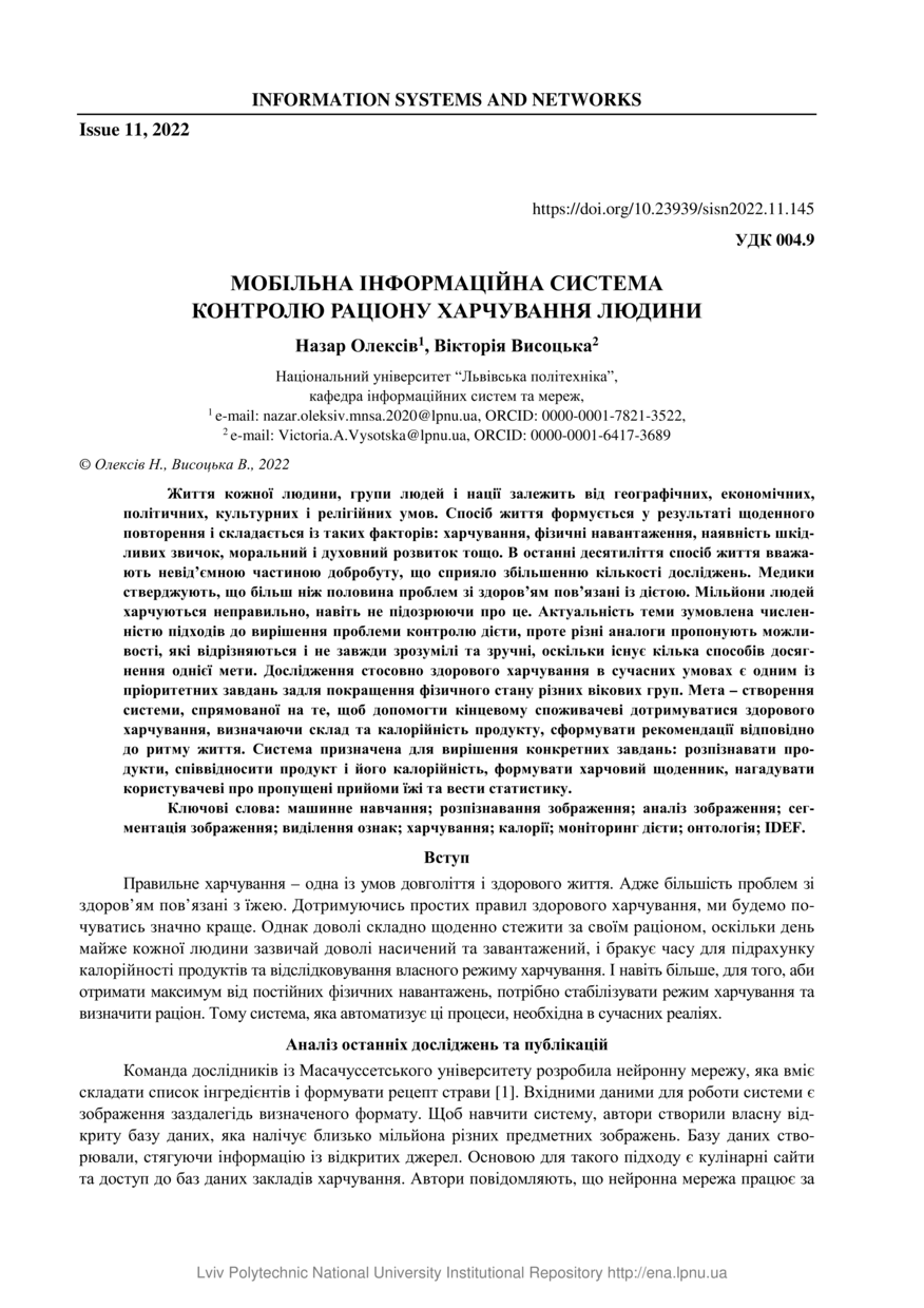 Олексів Н. Мобільна інформаційна система контролю раціону харчування людини / Назар Олексів, Вікторія Висоцька // Вісник Національного університету "Львівська політехніка". Інформаційні системи та мережі. — Львів : Видавництво Львівської політехніки, 2022. — № 11. — С. 145–172.