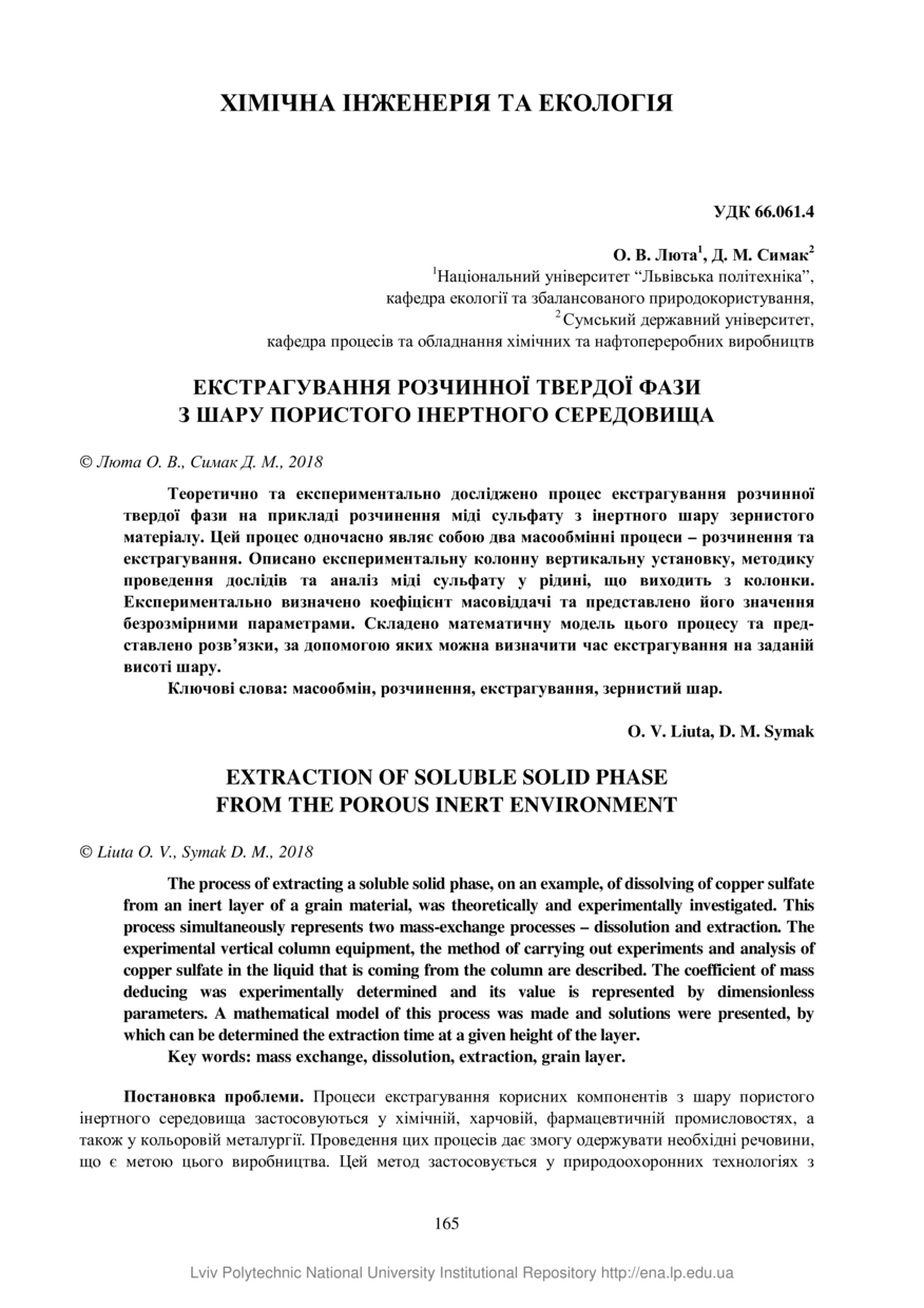 Люта О. В. Екстрагування розчинної твердої фази з шару пористого інертного середовища / О. В. Люта, Д. М. Симак // Вісник національного університету “Львівська політехніка”. Серія: Хімія, технологія речовин та їх застосування. — Львів : Видавництво Львівської політехніки, 2018. — № 886. — С. 165–170. — (Хімічна інженерія та екологія).