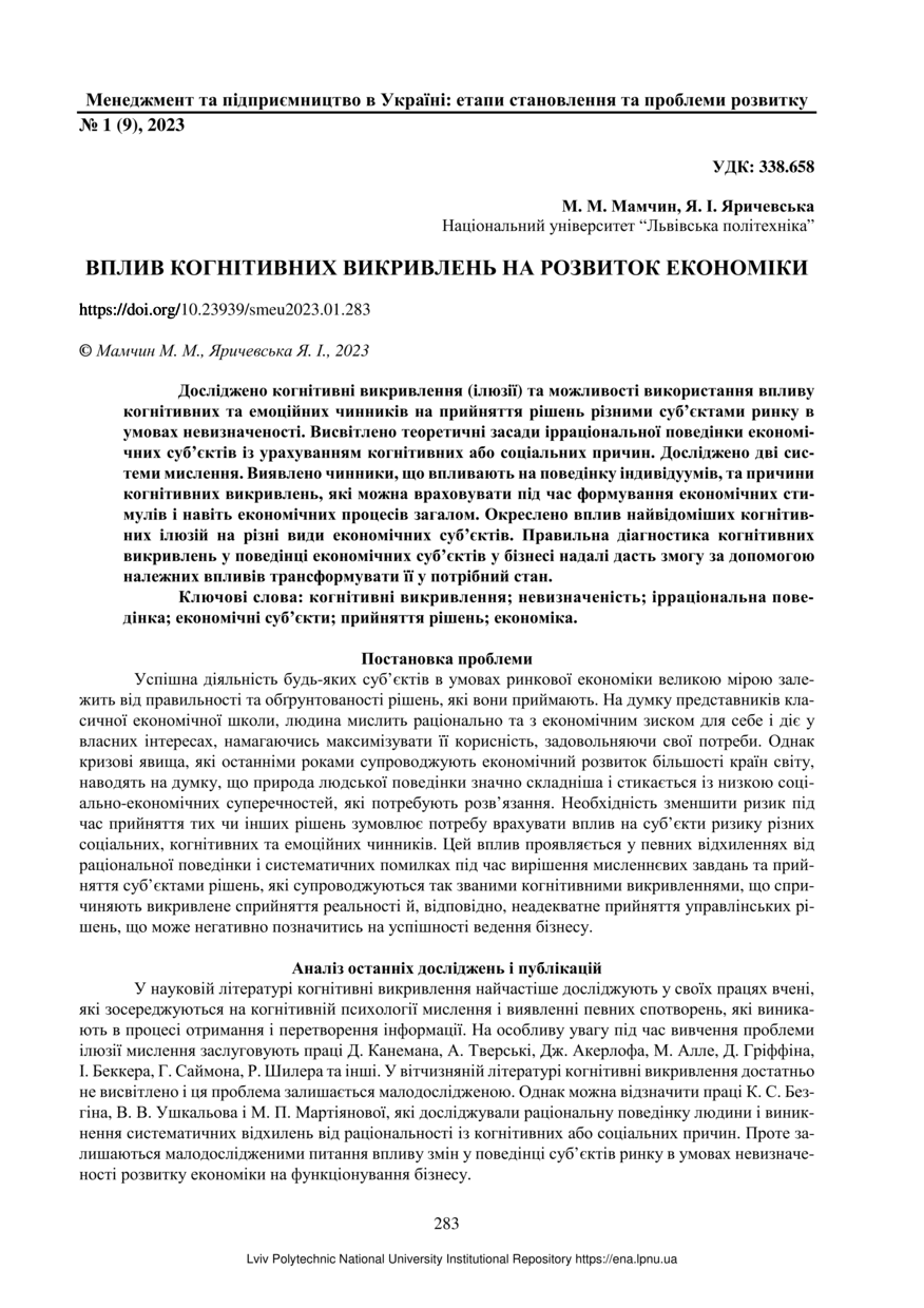 Мамчин М. М. Вплив когнітивних викривлень на розвиток економіки / М. М. Мамчин, Я. І. Яричевська // Менеджмент та підприємництво в Україні: етапи становлення і проблеми розвитку. — Львів : Видавництво Львівської політехніки, 2023. — Том 5. — № 1. — С. 283–288.