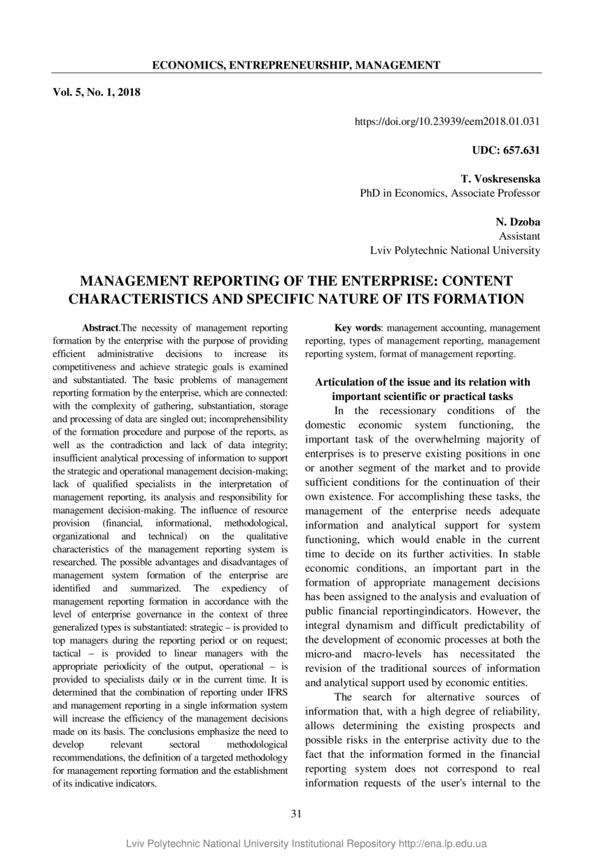 Voskresenska T. Management reporting of the enterprise: content characteristics and specific nature of its formation / T. Voskresenska, N. Dzoba // Economics, Entrepreneurship, Management. — Lviv : Lviv Politechnic Publishing House, 2018. — Vol 5. — No 1. — P. 31–38.