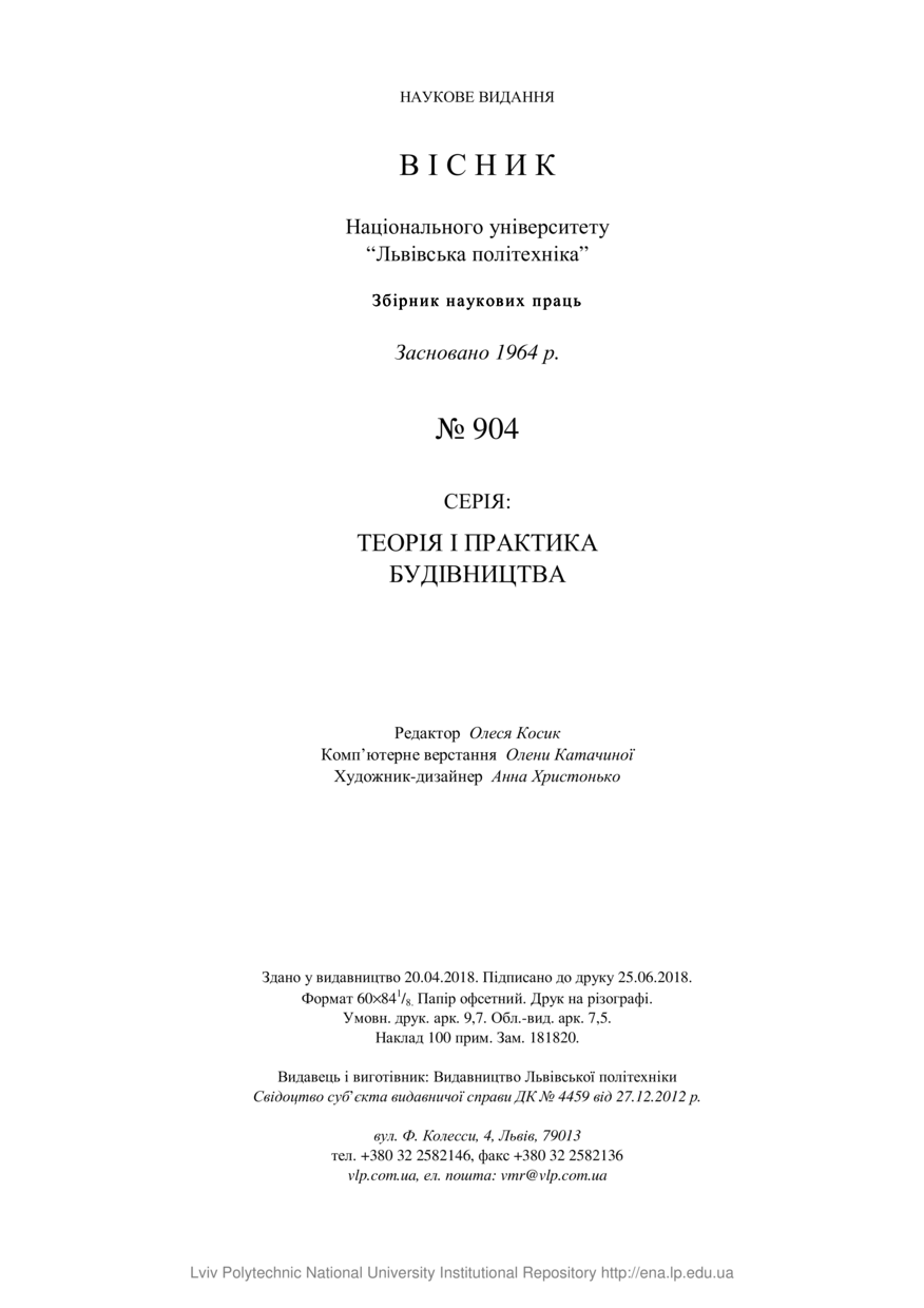 Видавнича сторінка // Вісник національного університету “Львівська політехніка”. Серія: Теорія і практика будівництва. — Львів : Видавництво Львівської політехніки, 2018. — № 904. — С. 84.