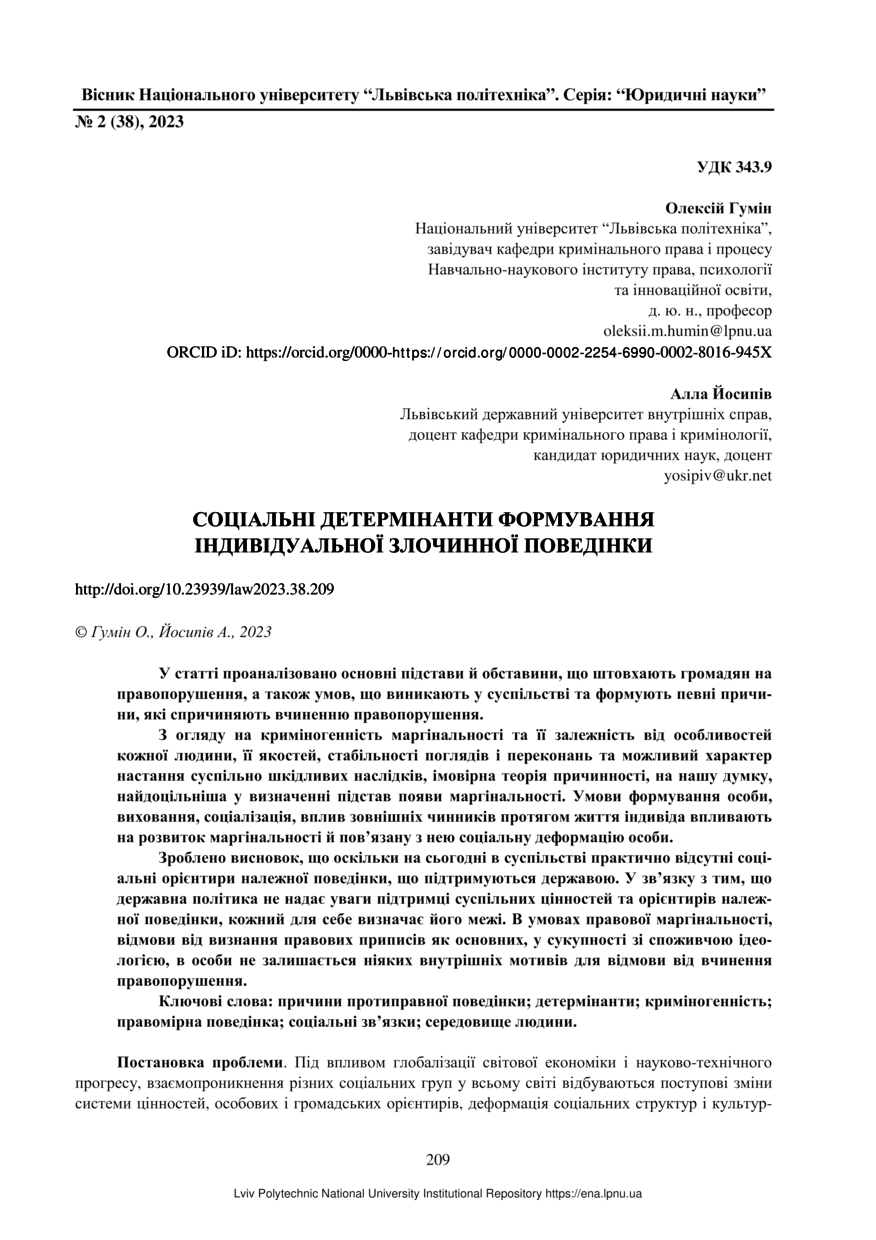 Гумін О. Соціальні детермінанти формування індивідуальної злочинної поведінки / Олексій Гумін, Алла Йосипів // Вісник Національного університету “Львівська політехніка”. Серія: “Юридичні науки”. — Львів : Видавництво Львівської політехніки, 2023. — № 2 (38). — С. 209–216.