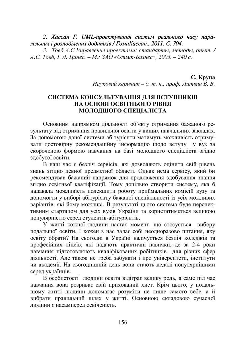 Крупа С. Система консультування для вступників на основі освітнього рівня молодшого спеціаліста / С. Крупа, В. В. Литвин // 76-та Студентська науково-технічна конференція : збірник тез доповідей, жовтень 2018 року, Львів. — Львів : Видавництво Львівської політехніки, 2018. — С. 156–158. — (Секція комп’ютерних наук та інформаційних технологій).