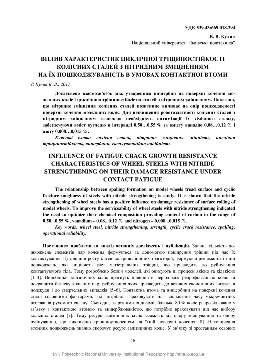 Кулик В. В. Вплив характеристик циклічної тріщиностійкості колісних сталей з нітридним зміцненням на їх пошкоджуваність в умовах контактної втоми / В. В. Кулик // Вісник Національного університету «Львівська політехніка». Серія: Оптимізація виробничих процесів і технічний контроль у машинобудуванні та приладобудуванні. — Львів : Видавництво Львівської політехніки, 2017. — Том 867. — С. 46–50.