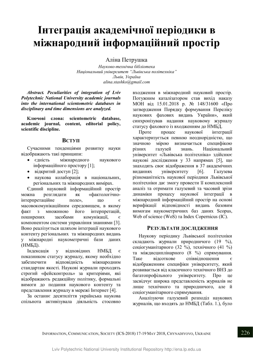 | dc.description.abstract | Peculiarities of integration of Lviv Polytechnic National University academic journals into the international scientometric databases in disciplinary and time dimensions are analyzed. | |