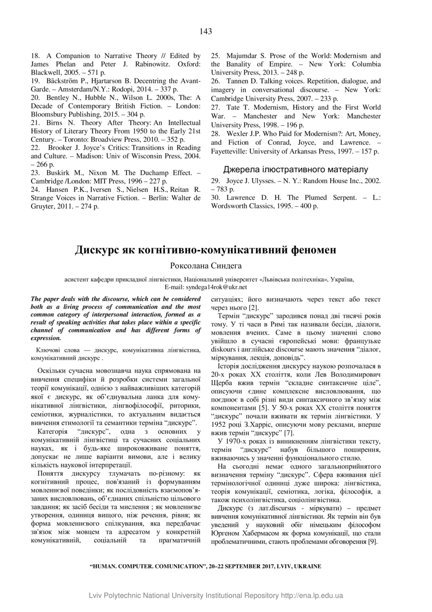 Синдега Р. Дискурс як когнітивно-комунікативний феномен / Роксолана Синдега // Людина. Комп’ютер. Комунікація : збірник наукових праць. — Львів : Видавництво Львівської політехніки, 2017. — С. 143–144. — (8. Дискурсологія).