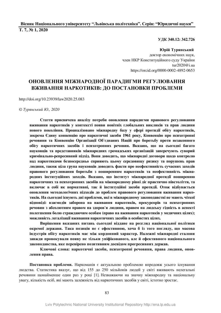 | dc.identifier.citation | Турянський Ю. Оновлення міжнародної парадигми регулювання вживання наркотиків: до постановки проблеми / Юрій Турянський // Вісник Національного університету “Львівська політехніка”. Серія: Юридичні науки. — Львів : Видавництво Львівської політехніки, 2020. — Том 7. — № 1. — С. 83–88. | |