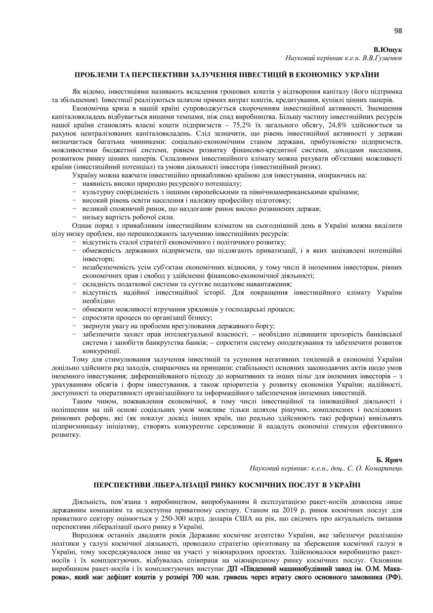 Ярич Б. Перспективи лібералізації ринку космічних послуг в Україні / Б. Ярич, С. О. Комаринець // 77-ма Студентська науково-технічна конференція. Секція "Публічне управління та адміністрування" : збірник тез доповідей, 7 листопада 2019 року, Львів. — Львів : Видавництво Львівської політехніки, 2019. — С. 98–99. — (Економічна теорія та історія розвитку економіки).
