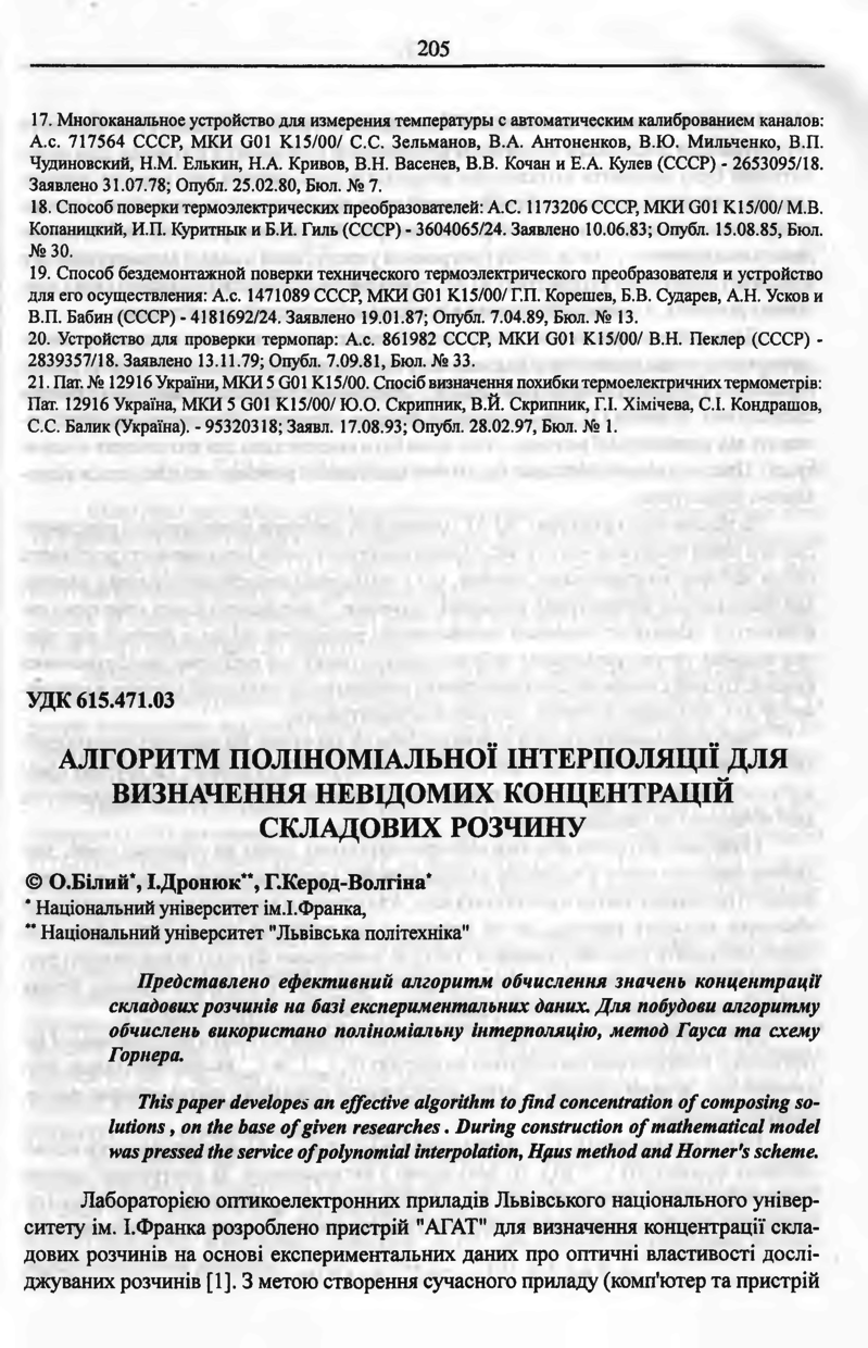 Білий О. Алгоритм поліноміальної інтерполяції для визначення невідомих концентрацій складових розчину / О. Білий, І. Дронюк, Г. Керод-Волгіна // Вісник Національного університету “Львівська політехніка”. — Львів : Видавництво Національного університету “Львівська політехніка”, 2002. — № 450 : Комп'ютерна інженерія та інформаційні технології. — С. 205–208.