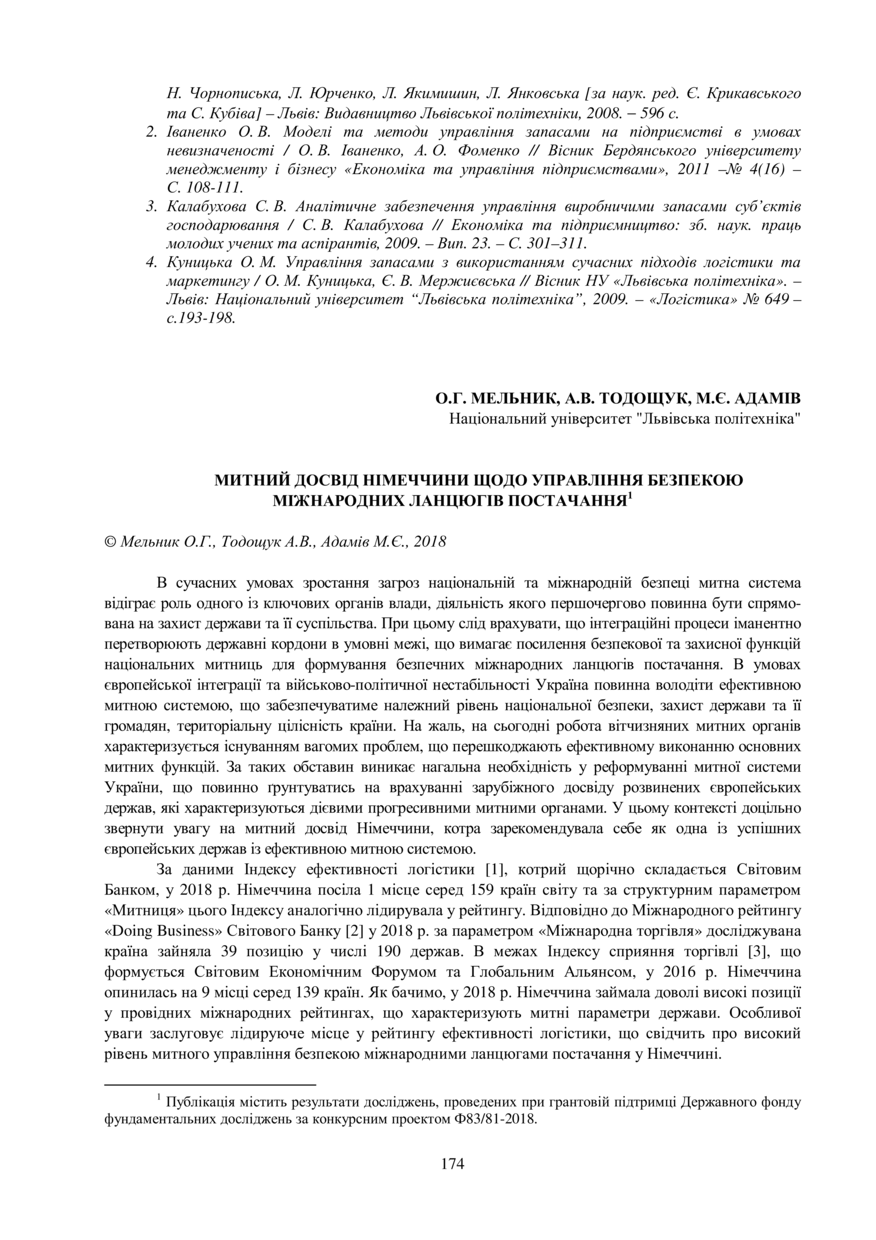 | dc.identifier.citationen | Melnik O. H. Mytnyi dosvid nimechchyny shchodo upravlinnia bezpekoiu mizhnarodnykh lantsiuhiv postachannia / O. H. Melnyk, A. V. Todoshchuk, M. Ye. Adamiv // Marketing and logistics in the system of management, 25–27 zhovtnia 2018 roku, Lviv. — Lviv : Vydavnytstvo Lvivskoi politekhniky, 2018. — P. 174–176. | |