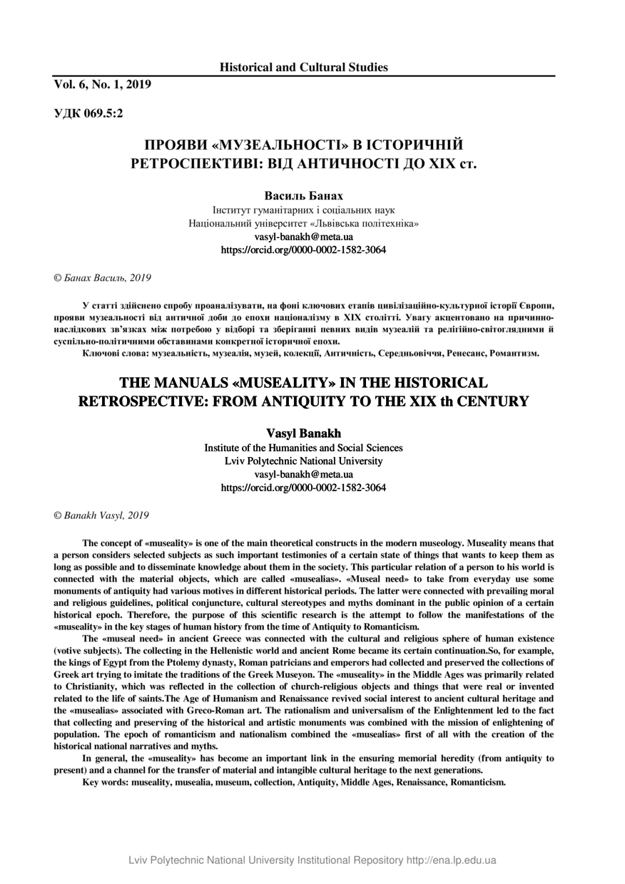 Банах В. Прояви «музеальності» в історичній ретроспективі: від античності до ХІХ ст / Василь Банах // Historical and Cultural Studies. — Lviv : Lviv Politechnic Publishing House, 2019. — Vol 6. — No 1. — P. 7–12.