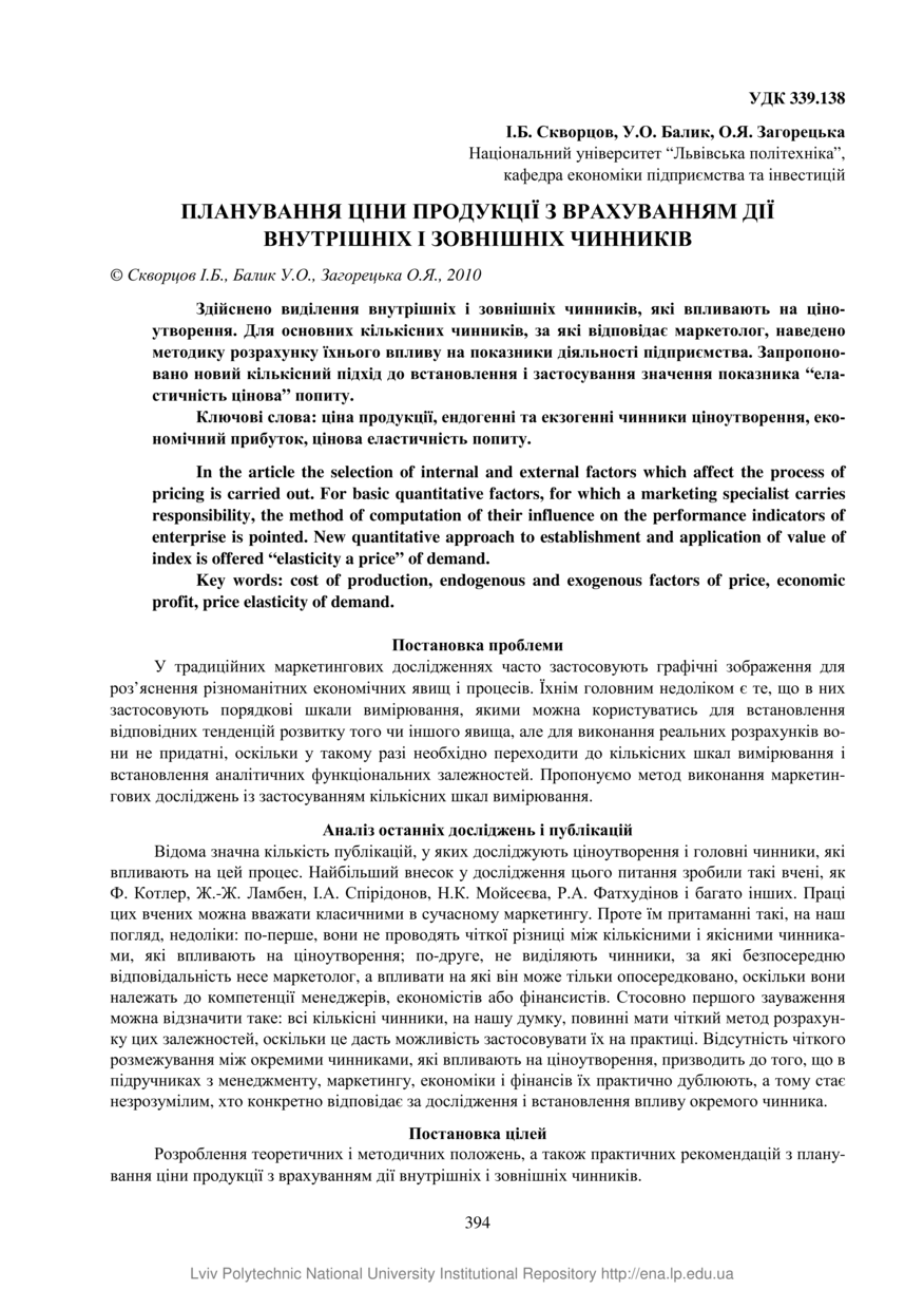 Скворцов І. Б. Планування ціни продукції з врахуванням дії внутрішніх і зовнішніх чинників / І. Б. Скворцов, У. О. Балик, О. Я. Загорецька // Вісник Національного університету “Львівська політехніка”. — Львів : Видавництво Львівської політехніки, 2010. — № 668 : Проблеми економіки та управління. — С. 394–402.