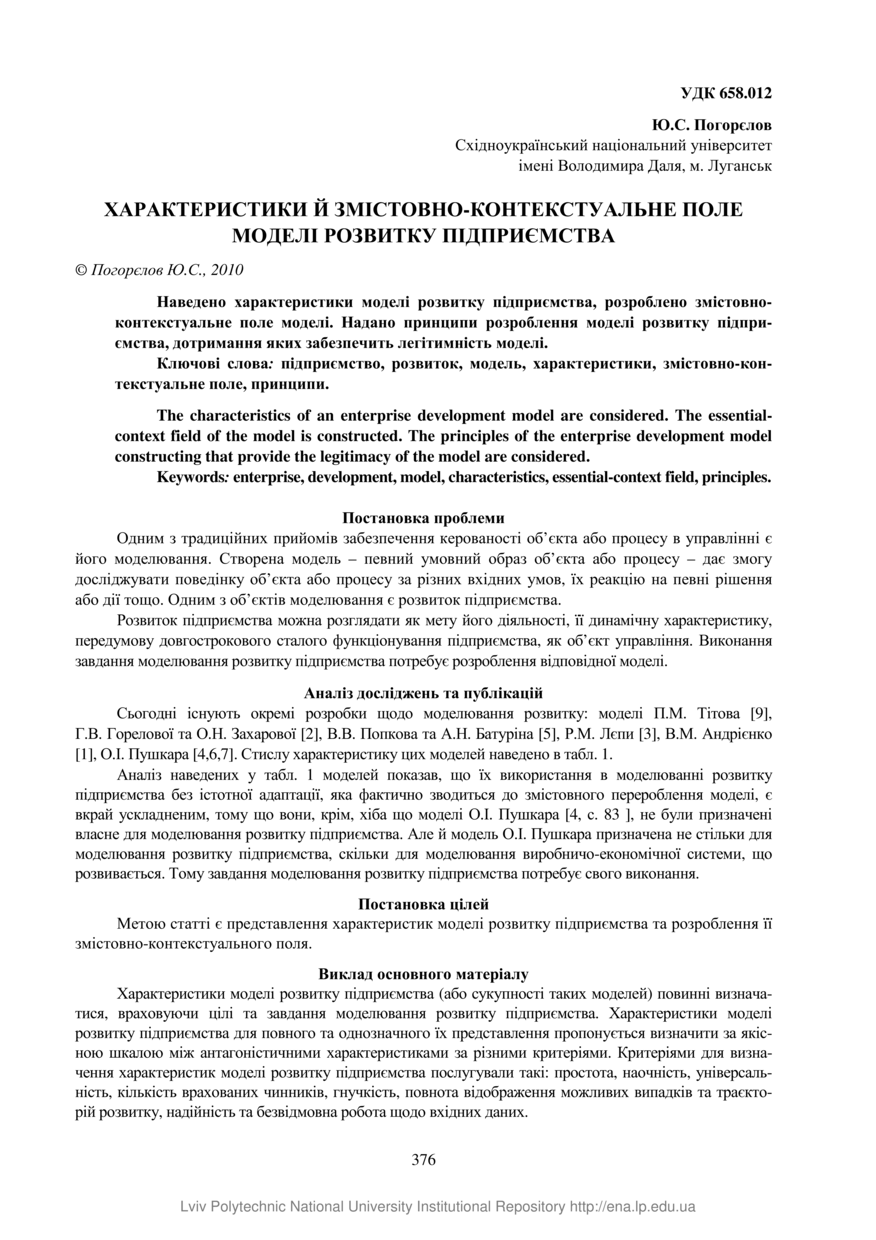 Погорєлов Ю. С. Характеристики й змістовно-контекстуальне поле моделі розвитку підприємства / Ю. С. Погорєлов // Вісник Національного університету “Львівська політехніка”. — Львів : Видавництво Львівської політехніки, 2010. — № 668 : Проблеми економіки та управління. — С. 376–381.