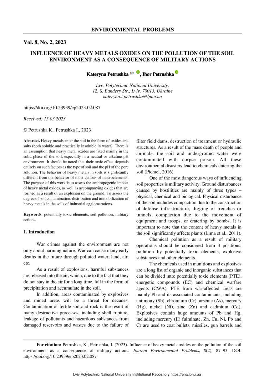 Petrushka K. Influence of heavy metals oxides on the pollution of the soil environment as a consequence of military actions / Kateryna Petrushka, Ihor Petrushka // Environmental Problems. — Lviv : Lviv Politechnic Publishing House, 2023. — Vol 8. — No 2. — P. 87–93.