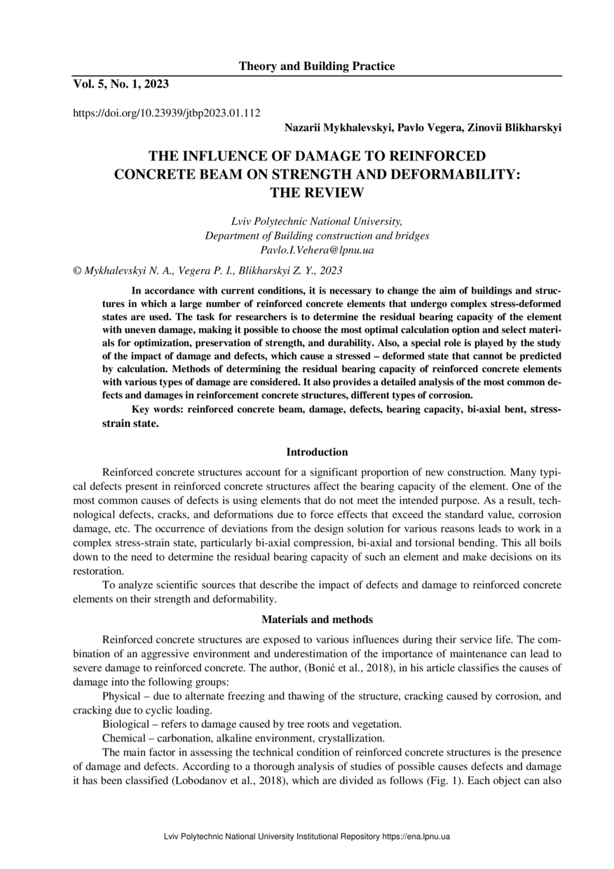 Mykhalevskyi N. The Influence of damage to reinfrorced concrete beam on strength and deformability: the review / N. Mykhalevskyi, P. Vegera, Z. Blikharskyy // Theory and Building Practice. — Lviv : Lviv Politechnic Publishing House, 2023. — Vol 5. — No 1. — P. 112–119.