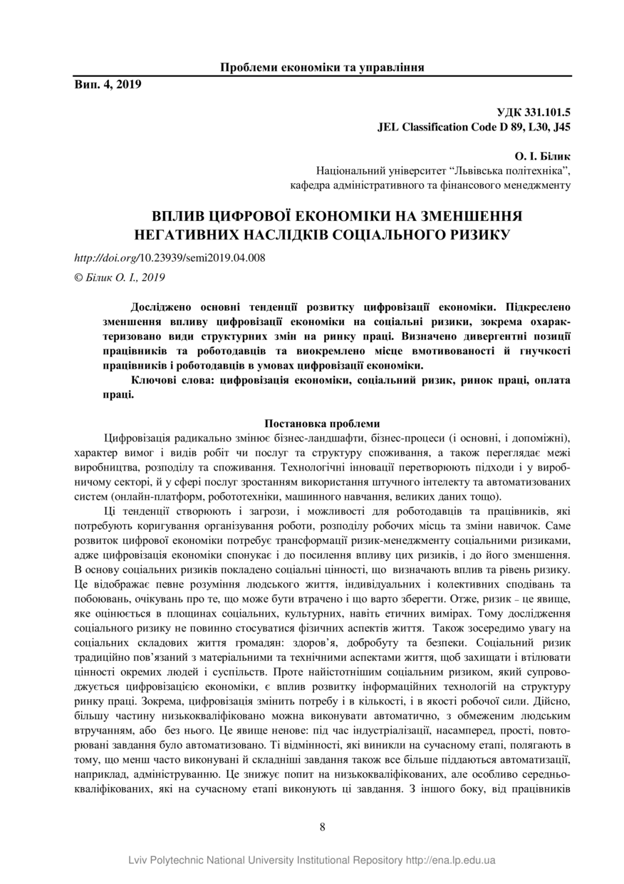 Білик О. І. Вплив цифрової економіки на зменшення негативних наслідків соціального ризику / О. І. Білик // Вісник Національного університету «Львівська політехніка». Серія: Проблеми економіки та управління. — Львів : Видавництво Львівської політехніки, 2019. — № 4. — С. 8–16.
