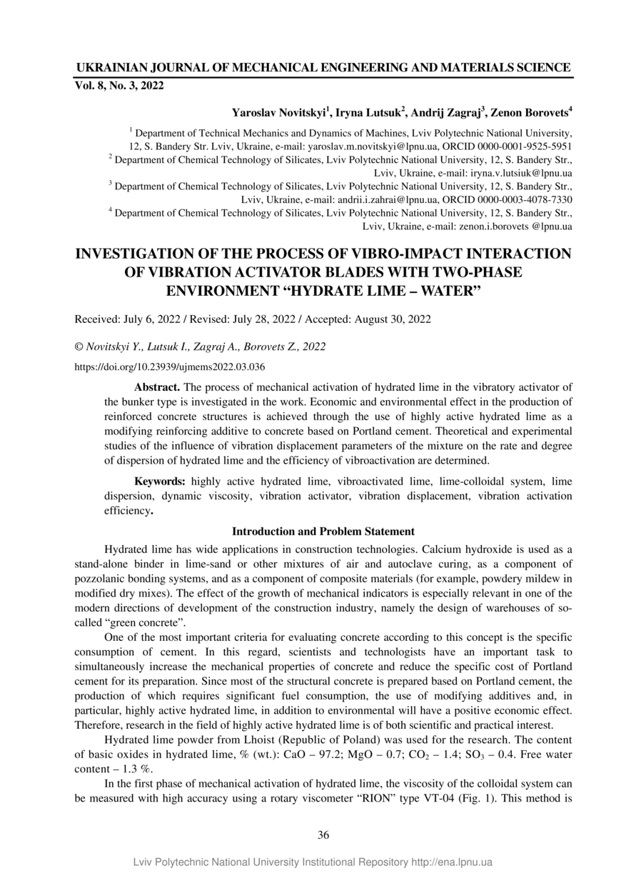 Investigation of the process of vibro-impact interaction of vibration activator blades with two-phase environment “Hydrate lime – water” / Yaroslav Novitskyi, Iryna Lutsuk, Andrij Zagraj, Zenon Borovets // Ukrainian Journal of Mechanical Engineering and Materials Science. — Lviv : Lviv Politechnic Publishing House, 2022. — Vol 8. — No 3. — P. 36–44.