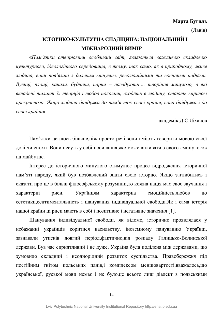 Бугиль М. Історико-культурна спадщина: національний і міжнародний вимір / Марта Бугиль // Історико-культурна спадщина: європейський вимір : тези Всеукраїнської науково-практичної конференції, 1 червня, 2018 року, Львів. — Львів : Інтерпрінт, 2018. — С. 14–16.