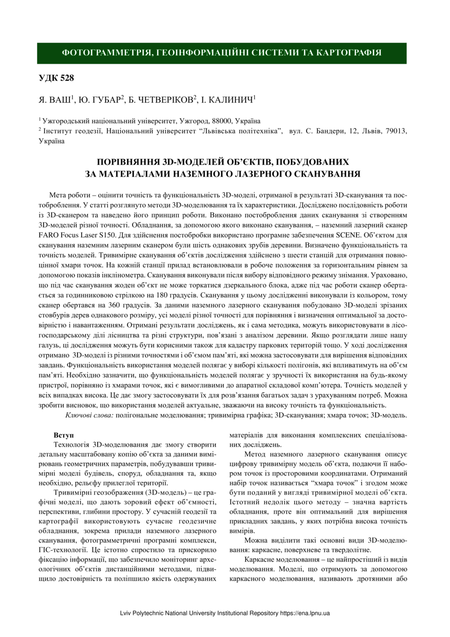 | dc.identifier.citationen | Comparison of creation 3D-models of objects based on materials from terrastrial laser scanning / Ya. Vash, Yu. Gubar, B. Chetverikov, I. Kalynych // Modern achievements of geodesic science and industry. — Lviv : Lviv Politechnic Publishing House, 2023. — Vol 1. — No 45. — P. 112–118. | |