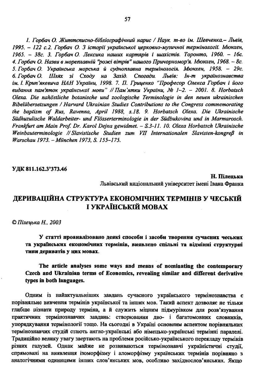 Пілецька Н. Дериваційна структура економічних термінів у чеській і українській мовах / Н. Пілецька // Вісник Національного університету “Львівська політехніка”. — Львів : Видавництво Національного університету “Львівська політехніка”, 2003. — № 490 : Проблеми української термінології. — С. 57–62. — (Лексикографія та міжмовні зв’язки).