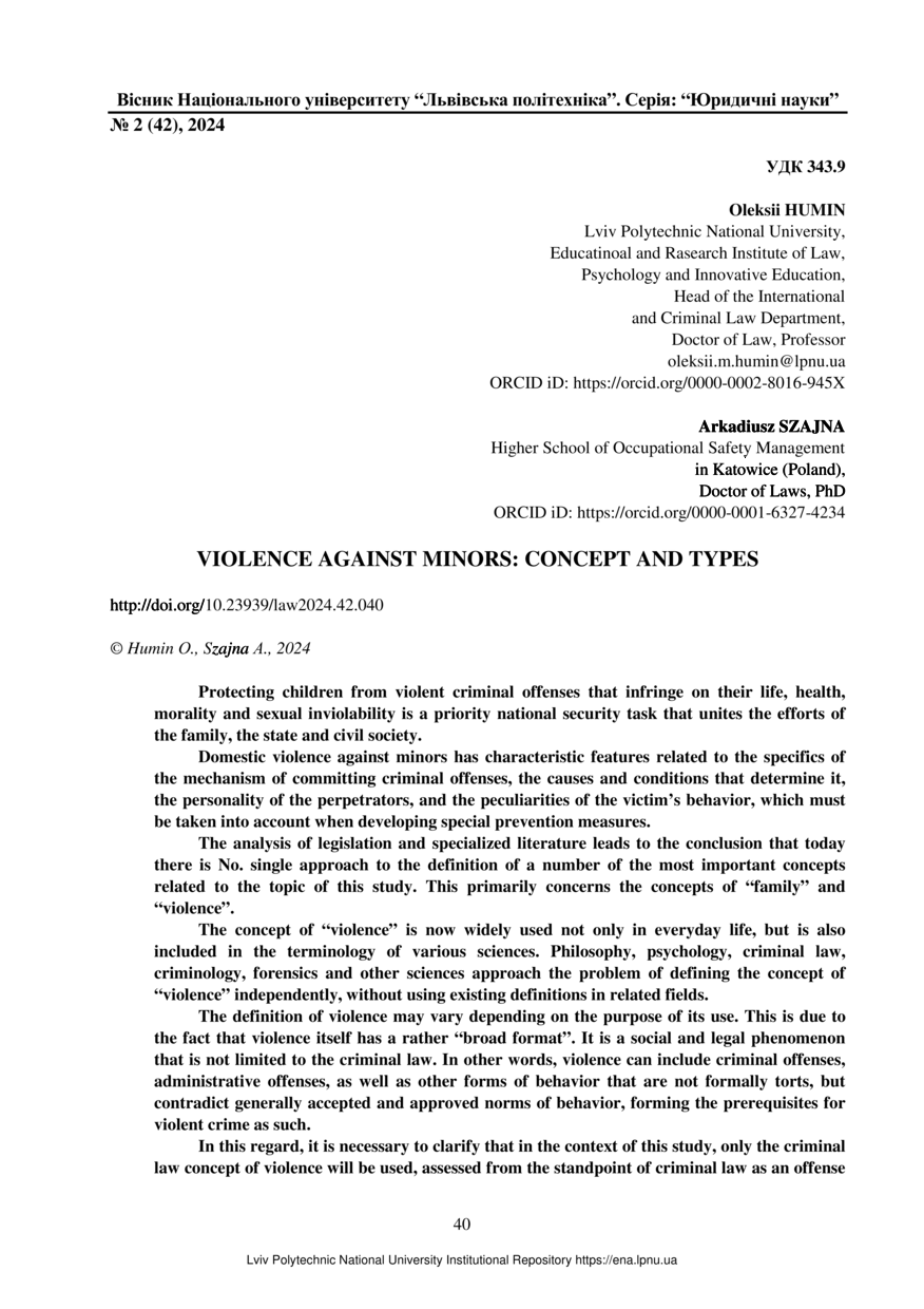 Humin O. Violence against minors: concept and types / Oleksii Humin, Arkadiusz Szajna // Bulletin of Lviv Polytechnic National University. Series: Legal Sciences. — Lviv : Lviv Politechnic Publishing House, 2024. — No 2 (42). — P. 40–45.
